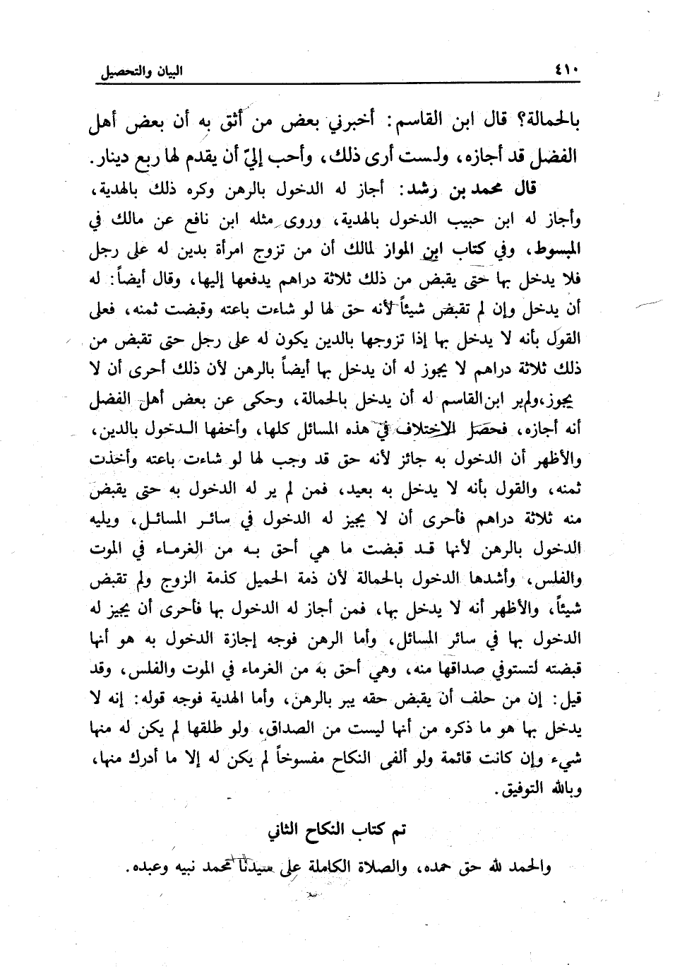 قال محمد بن رشد: أجاز له الدخول بالرهن وكره ذلك بالهدية، وأجاز له ابن حبيب الدخول بالهدية، وروى مثله ابن نافع عن مالك في المبسوط، وفي كتاب ابن المواز لمالك أن من تزوج امرأة بدين له على رجل فلا يدخل بها حتى يقبض من ذلك ثلاثة دراهم يدفعها إليها، وقال أيضا: له أن يدخل وإن لم تقبض شيئا لأنه حق لها لو شاءت باعته وقبضت ثمنه، فعلى القول بأنه لا يدخل بها إذا تزوجها بالدين يكون له على رجل حتى تقبض من ذلك ثلاثة دراهم لا يجوز له أن يدخل بها أيضا بالرهن لأن ذلك أحرى أن لا يجوز، ولم ير ابن القاسم له أن يدخل بالحمالة، وحكى عن بعض أهل الفضل أنه أجازه، فحصل الاختلاف في هذه المسائل كلها، وأخفها الدخول بالدين، والأظهر أن الدخول به جائز لأنه حق قد وجب لها لو شاءت باعته وأخذت ثمنه، والقول بأنه لا يدخل به بعيد، فمن لم ير له الدخول به حتى يقبض منه ثلاثة دراهم فأحرى أن لا يجيز له الدخول في سائر المسائل، ويليه الدخول بالرهن لأنها قد قبضت ما هي أحق به من الغرماء في الموت والفلس، وأشدها الدخول بالحمالة؛ لأن ذمة الحميل كذمة الزوج ولم تقبض شيئا، والأظهر أنه لا يدخل بها، فمن أجاز له الدخول بها فأحرى أن يجيز له الدخول بها في سائر المسائل، وأما الرهن فوجه إجازة الدخول به هو أنها قبضته لتستوفي صداقها منه، وهي أحق به من الغرماء في الموت والفلس، وقد قيل: إن من حلف أن يقبض حقه يبر بالرهن، وأما الهدية فوجه قوله: إنه لا يدخل بها هو ما ذكره من أنها ليست من الصداق، ولو طلقها لم يكن له منها شيء وإن كانت قائمة ولو ألفى النكاح مفسوخا لم يكن له إلا ما أدرك منها، وبالله التوفيق.
