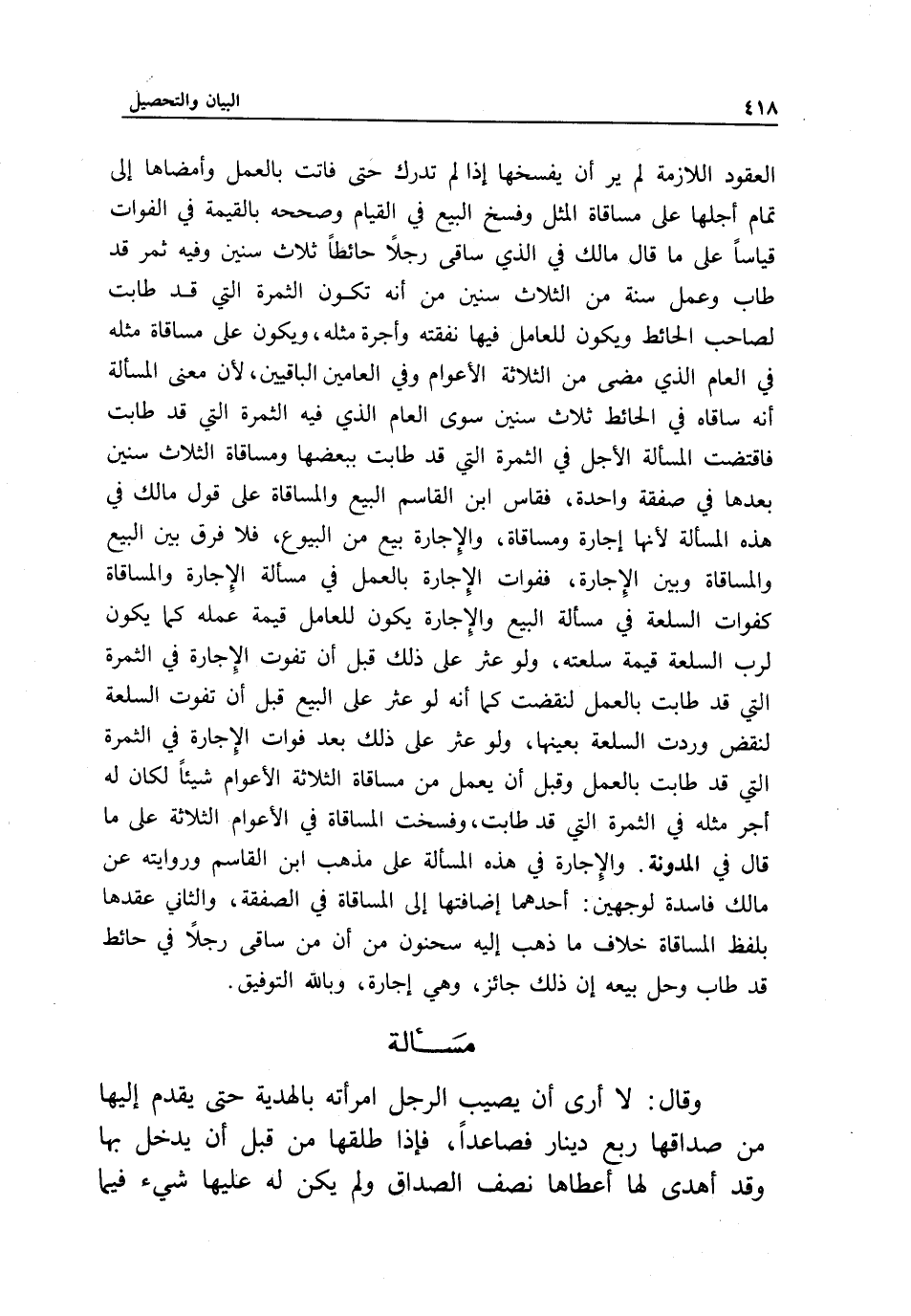 العقود اللازمة لم ير أن يفسخها إذا لم تدرك حتى فاتت بالعمل وأمضاها إلى تمام أجلها على مساقاة المثل وفسخ البيع في القيام وصححه بالقيمة في الفوات قياسا على ما قال مالك في الذي ساقى رجلا حائطا ثلاث سنين وفيه ثمر قد طاب وعمل سنة من الثلاث سنين من أنه تكون الثمرة التي قد طابت لصاحب الحائط ويكون للعامل فيها نفقته وأجرة مثله، ويكون على مساقاة مثله في العام الذي مضى من الثلاثة الأعوام وفي العامين الباقيين؛ لأن معنى المسألة أنه ساقاه في الحائط ثلاث سنين سوى العام الذي فيه الثمرة التي قد طابت فاقتضت المسألة الأجل في الثمرة التي قد طابت ببعضها ومساقاة الثلاث سنين بعدها في صفقة واحدة، فقاس ابن القاسم البيع والمساقاة على قول مالك في هذه المسألة لأنها إجارة ومساقاة، والإجارة بيع من البيوع، فلا فرق بين البيع والمساقاة وبين الإجارة، ففوات الإجارة بالعمل في مسألة الإجارة والمساقاة كفوات السلعة في مسألة البيع والإجارة يكون للعامل قيمة عمله كما يكون لرب السلعة قيمة سلعته، ولو عثر على ذلك قبل أن تفوت الإجارة في الثمرة التي قد طابت بالعمل لنقضت كما أنه لو عثر على البيع قبل أن تفوت السلعة لنقض وردت السلعة بعينها، ولو عثر على ذلك بعد فوات الإجارة في الثمرة التي قد طابت بالعمل وقبل أن يعمل من مساقاة الثلاثة الأعوام شيئا لكان له أجر مثله في الثمرة التي قد طابت، وفسخت المساقاة في الأعوام الثلاثة على ما قال في المدونة. والإجارة في هذه المسألة على مذهب ابن القاسم وروايته عن مالك فاسدة لوجهين: أحدهما إضافتها إلى المساقاة في الصفقة، والثاني عقدها بلفظ المساقاة خلاف ما ذهب إليه سحنون من أن من ساقى رجلا في حائط قد طاب وحل بيعه إن ذلك جائز، وهي إجارة، وبالله التوفيق.