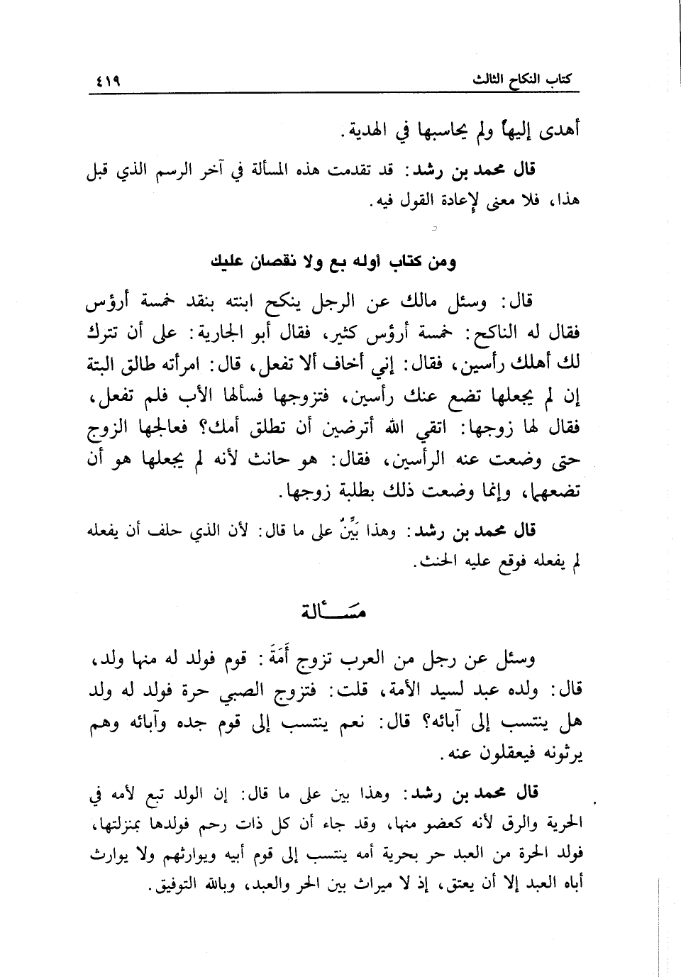 قال محمد بن رشد: قد تقدمت هذه المسألة في آخر الرسم الذي قبل هذا، فلا معنى لإعادة القول فيه.