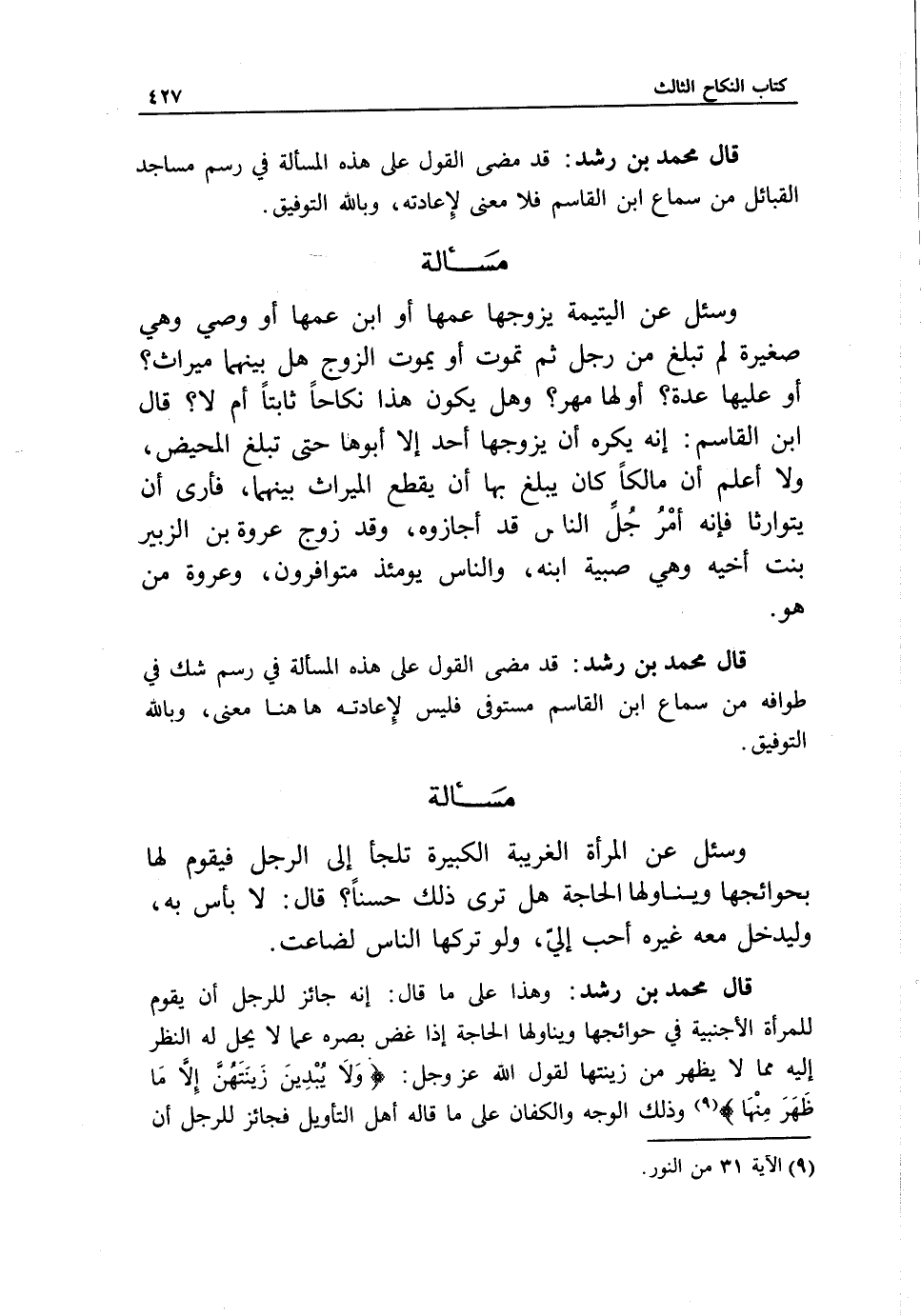 مسألة وسئل عن اليتيمة يزوجها عمها أو ابن عمها أو وصي وهي صغيرة لم تبلغ من رجل ثم تموت أو يموت الزوج هل بينهما ميراث؟ أو عليها عدة؟ أو لها مهر؟ وهل يكون هذا نكاحا ثابتا أم لا؟ قال ابن القاسم: إنه يكره أن يزوجها أحد إلا أبوها حتى تبلغ المحيض، ولا أعلم أن مالكا كان يبلغ بها أن يقطع الميراث بينهما، فأرى أن يتوارثا فإنه أمر جل الناس قد أجازوه، وقد زوج عروة بن الزبير بنت أخيه وهي صبية ابنه، والناس يومئذ متوافرون، وعروة من هو.
