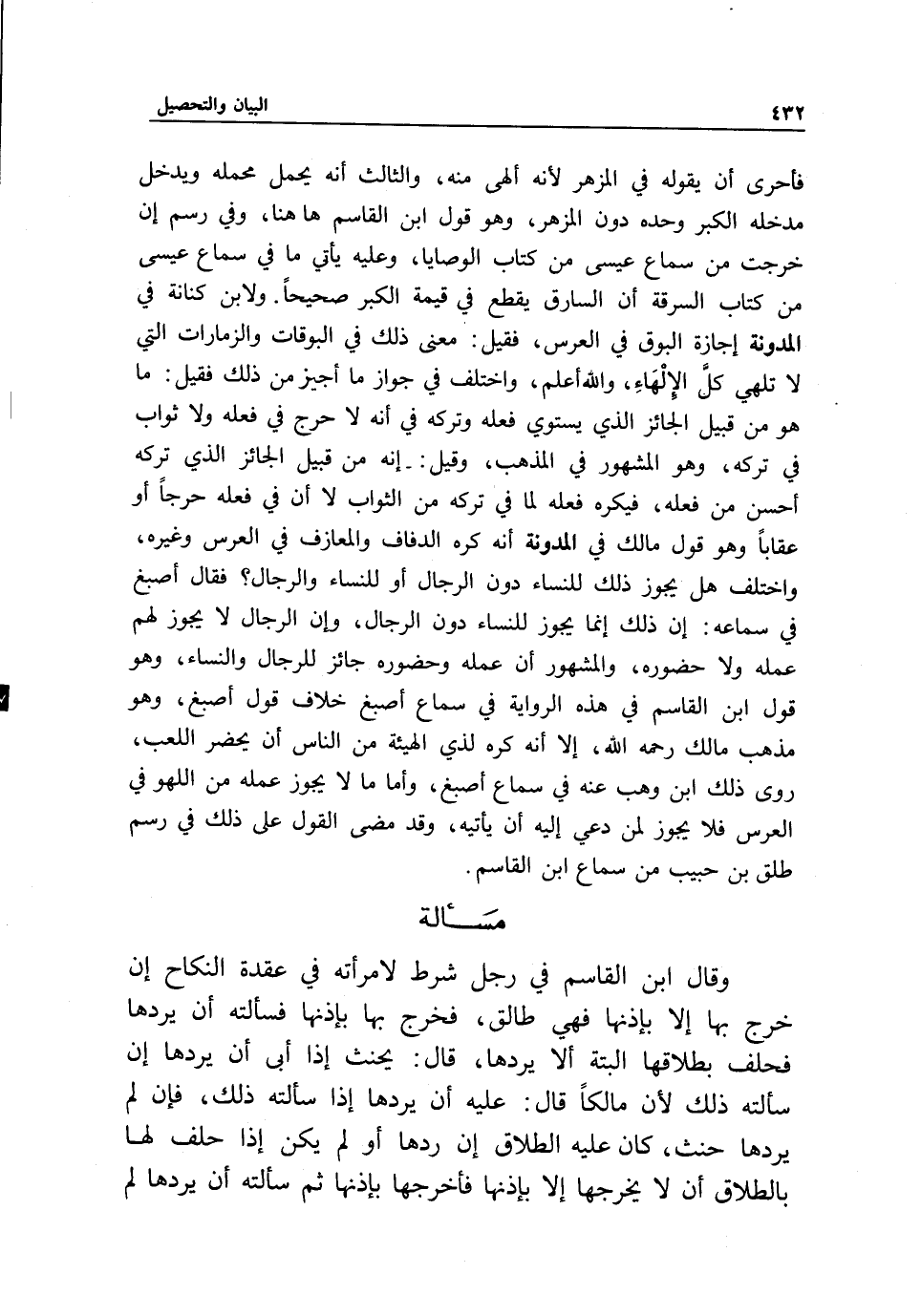 فأحرى أن يقوله في المزهر لأنه ألهى منه، والثالث أنه يحمل محمله ويدخل مدخله الكبر وحده دون المزهر،. وهو قول ابن القاسم هاهنا، وفي رسم إن خرجت من سماع عيسى من كتاب الوصايا، وعليه يأتي ما في سماع عيسى من كتاب السرقة أن السارق يقطع في قيمة الكبر صحيحا. ولابن كنانة في المدونة إجازة البوق في العرس، فقيل: معنى ذلك في البوقات والزمارات التي لا تلهي كل الإلهاء، والله أعلم، واختلف في جواز ما أجيز من ذلك فقيل: ما هو من قبيل الجائز الذي يستوي فعله وتركه في أنه لا حرج في فعله ولا ثواب في تركه، وهو المشهور في المذهب، وقيل: إنه من قبيل الجائز الذي تركه أحسن من فعله، فيكره فعله لما في تركه من الثواب لا أن في فعله حرجا أو عقابا وهو قول مالك في المدونة أنه كره الدفاف والمعازف في العرس وغيره، واختلف هل يجوز ذلك للنساء دون الرجال أو للنساء والرجال؟ فقال أصبغ في سماعه: إن ذلك إنما يجوز للنساء دون الرجال، وإن الرجال لا يجوز لهم عمله ولا حضوره، والمشهور أن عمله وحضوره جائز للرجال والنساء، وهو قول ابن القاسم في هذه الرواية في سماع أصبغ خلاف قول أصبغ، وهو مذهب مالك - رَحِمَهُ اللَّهُ -، إلا أنه كره لذي الهيئة من الناس أن يحضر اللعب، روى ذلك ابن وهب عنه في سماع أصبغ، وأما ما لا يجوز عمله من اللهو في العرس فلا يجوز لمن دعي إليه أن يأتيه، وقد مضى القول على ذلك في رسم طلق بن حبيب من سماع ابن القاسم.