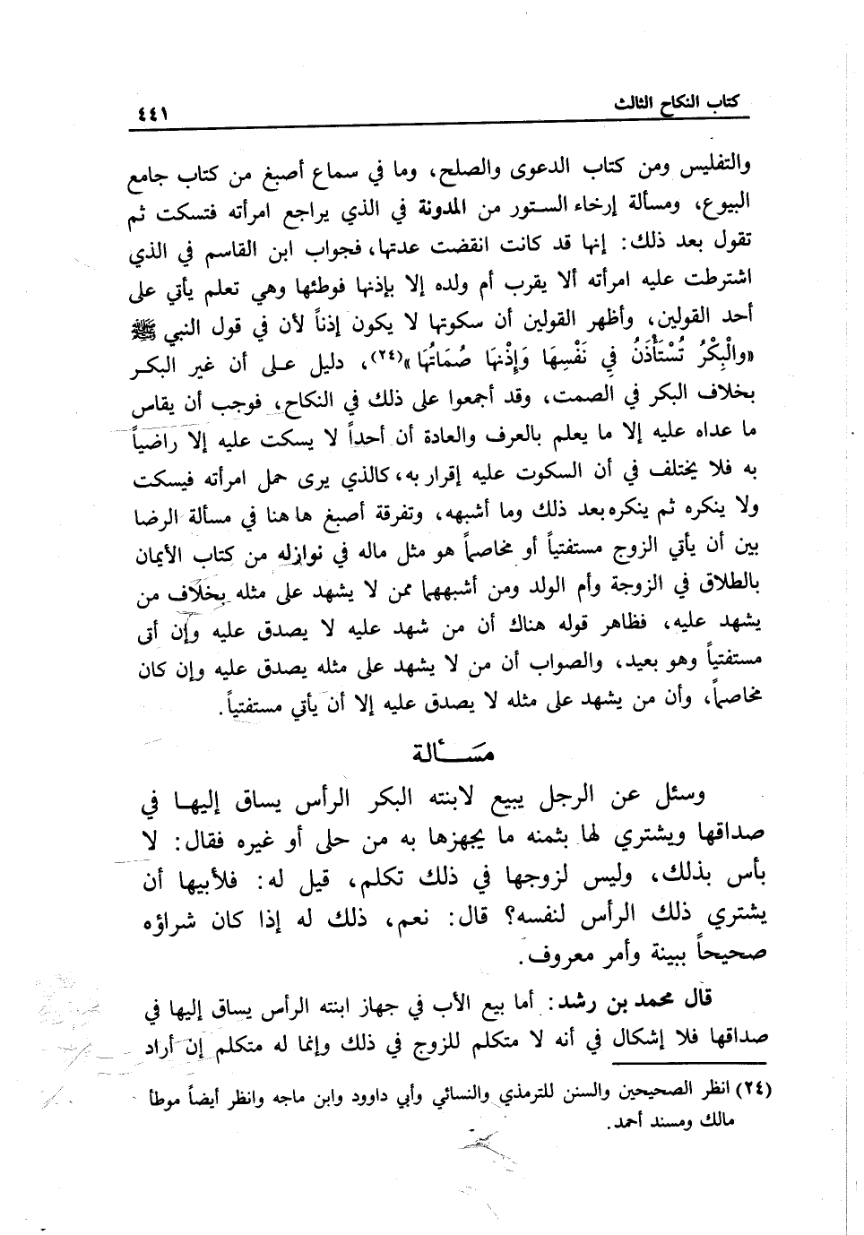 مسألة وسئل عن الرجل يبيع لابنته البكر الرأس يساق إليها في صداقها ويشتري لها بثمنه ما يجهزها به من حلى أو غيره فقال: لا بأس بذلك، وليس لزوجها في ذلك تكلم، قيل له: فلأبيها أن يشتري ذلك الرأس لنفسه؟ قال: نعم، ذلك له إذا كان شراؤه صحيحا ببينة وأمر معروف.