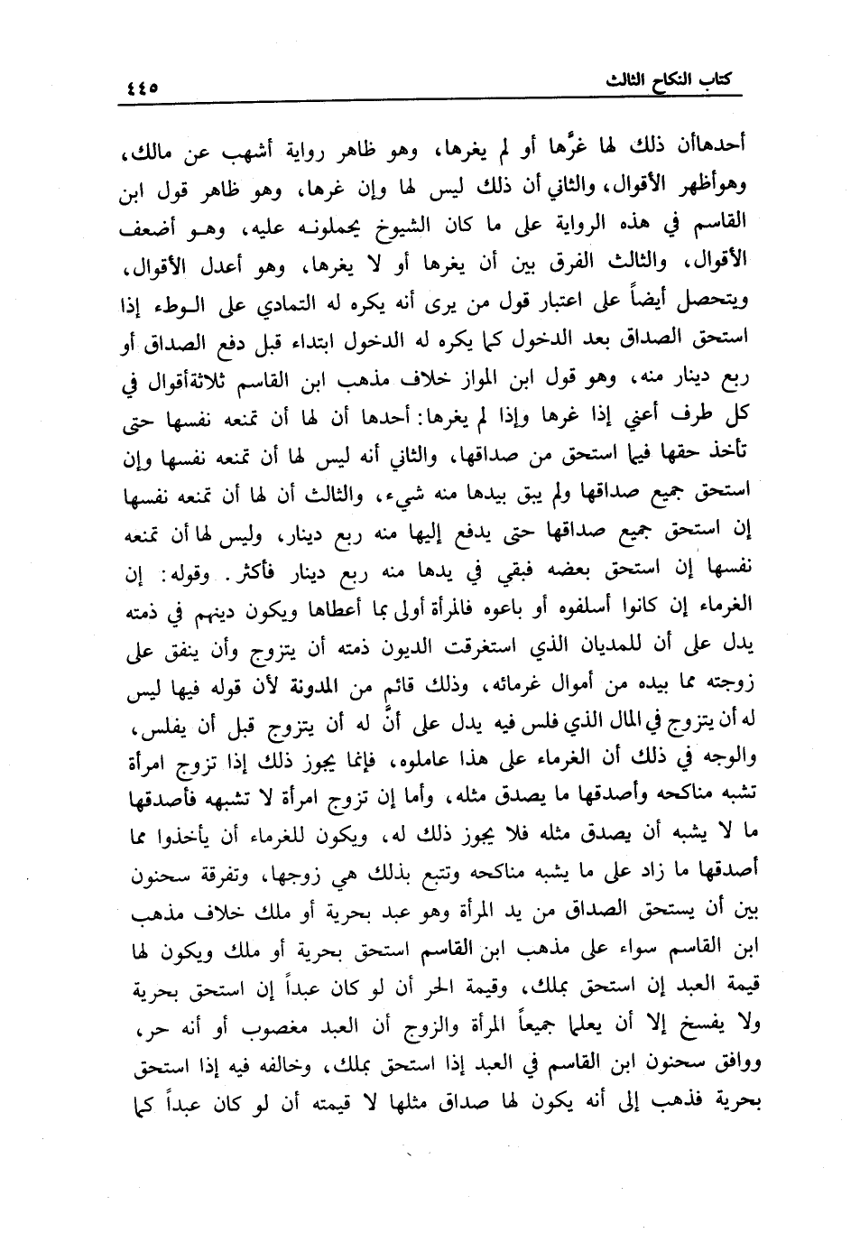 أحدها أن ذلك لها غرها أو لم يغرها، وهو ظاهر رواية أشهب عن مالك، وهو أظهر الأقوال، والثاني أن ذلك ليس لها وإن غرها، وهو ظاهر قول ابن القاسم في هذه الرواية على ما كان الشيوخ يحملونه عليه، وهو أضعف الأقوال، والثالث الفرق بين أن يغرها أو لا يغرها، وهو أعدل الأقوال، ويتحصل أيضا على اعتبار قول من يرى أنه يكره له التمادي على الوطء إذا استحق الصداق بعد الدخول كما يكره له الدخول ابتداء قبل دفع الصداق أو ربع دينار منه، وهو قول ابن المواز خلاف مذهب ابن القاسم ثلاثة أقوال في كل طرف أعني إذا غرها وإذا لم يغرها: أحدها أن لها أن تمنعه نفسها حتى تأخذ حقها فيما استحق من صداقها، والثاني أنه ليس لها أن تمنعه نفسها وإن استحق جميع صداقها ولم يبق بيدها منه شيء، والثالث أن لها أن تمنعه نفسها إن استحق جميع صداقها حتى يدفع إليها منه ربع دينار، وليس لها أن تمنعه نفسها إن استحق بعضه فبقي في يدها منه ربع دينار فأكثر. وقوله: إن الغرماء إن كانوا أسلفوه أو باعوه فالمرأة أولى بما أعطاها ويكون دينهم في ذمته يدل على أن للمديان الذي استغرقت الديون ذمته أن يتزوج وأن ينفق على زوجته مما بيده من أموال غرمائه، وذلك قائم من المدونة لأن قوله فيها ليس له أن يتزوج في المال الذي فلس فيه يدل على أن له أن يتزوج قبل أن يفلس، والوجه في ذلك أن الغرماء على هذا عاملوه، فإنما يجوز ذلك إذا تزوج امرأة تشبه مناكحه وأصدقها ما يصدق مثله، وأما إن تزوج امرأة لا تشبهه فأصدقها ما لا يشبه أن يصدق مثله فلا يجوز ذلك له، ويكون للغرماء أن يأخذوا مما أصدقها ما زاد على ما يشبه مناكحه وتتبع بذلك هي زوجها، وتفرقة سحنون بين أن يستحق الصداق من يد المرأة وهو عبد بحرية أو ملك خلاف مذهب ابن القاسم سواء على مذهب ابن القاسم استحق بحرية أو ملك ويكون لها قيمة العبد إن استحق بملك، وقيمة الحر أن لو كان عبدا إن استحق بحرية ولا يفسخ إلا أن يعلما جميعا المرأة والزوج أن العبد مغصوب أو أنه حر، ووافق سحنون ابن القاسم في العبد إذا استحق بملك، وخالفه فيه إذا استحق بحرية فذهب إلى أنه يكون لها صداق مثلها لا قيمته أن لو كان عبدا كما