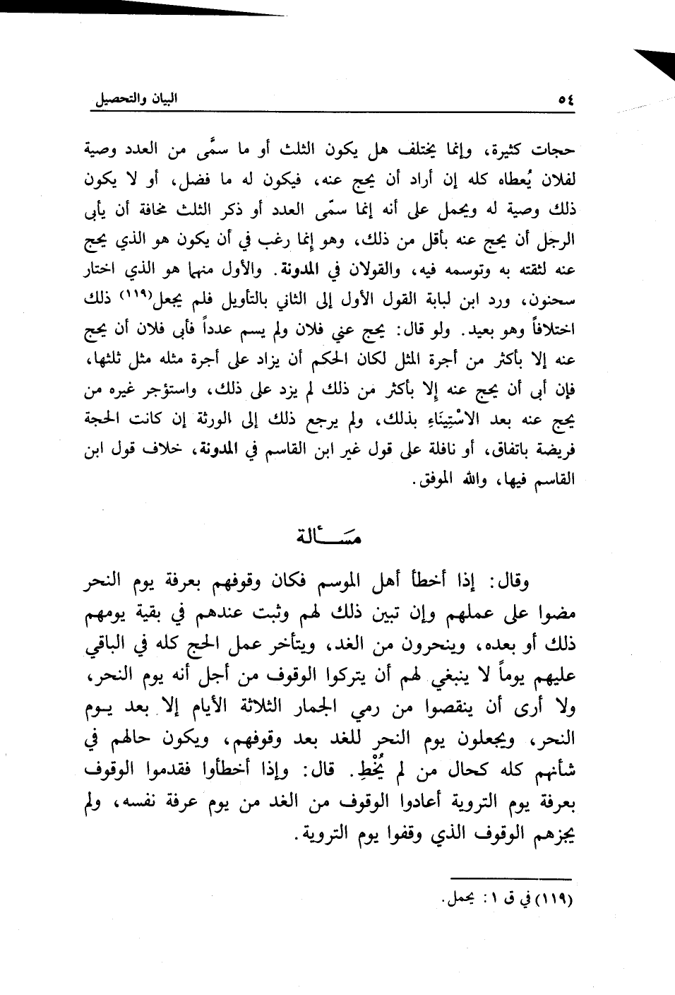 مسألة وقال: إذا أخطأ أهل الموسم فكان وقوفهم بعرفة يوم النحر مضوا على عملهم وإن تبين ذلك لهم وثبت عندهم في بقية يومهم ذلك أو بعده، وينحرون من الغد، ويتأخر عمل الحج كله في الباقي عليهم يوما لا ينبغي لهم أن يتركوا الوقوف من أجل أنه يوم النحر، ولا أرى أن ينقصوا من رمي الجمار الثلاثة الأيام إلا بعد يوم النحر، ويجعلون يوم النحر للغد بعد وقوفهم، ويكون حالهم في شأنهم كله كحال من لم يخط. قال: وإذا أخطئوا فقدموا الوقوف بعرفة يوم التروية أعادوا الوقوف من الغد من يوم عرفة نفسه، ولم يجزهم الوقوف الذي وقفوا يوم التروية.