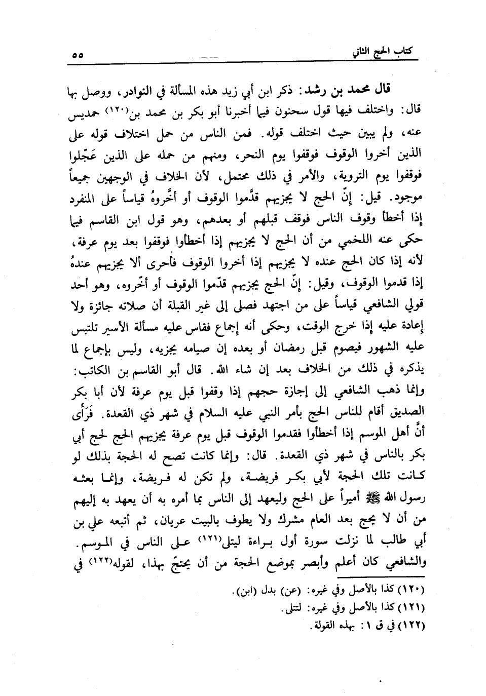 قال محمد بن رشد: ذكر ابن أبي زيد هذه المسألة في النوادر، ووصل بها قال: واختلف فيها قول سحنون فيما أخبرنا أبو بكر بن محمد بن حمديس عنه، ولم يبين حيث اختلف قوله. فمن الناس من حمل اختلاف قوله على الذين أخروا الوقوف فوقفوا يوم النحر، ومنهم من حمله على الذين عجلوا فوقفوا يوم التروية، والأمر في ذلك محتمل؛ لأن الخلاف في الوجهين جميعا موجود. قيل: إن الحج لا يجزيهم قدموا الوقوف أو أخروه قياسا على المنفرد إذا أخطأ وقوف الناس فوقف قبلهم أو بعدهم، وهو قول ابن القاسم فيما حكى عنه اللخمي من أن الحج لا يجزيهم إذا أخطئوا فوقفوا بعد يوم عرفة؛ لأنه إذا كان الحج عنده لا يجزيهم إذا أخروا الوقوف فأحرى ألا يجزيهم عنده إذا قدموا الوقوف، وقيل: إن الحج يجزيهم قدموا الوقوف أو أخروه، وهو أحد قولي الشافعي قياسا على من اجتهد فصلى إلى غير القبلة: إن صلاته جائزة ولا إعادة عليه إذا خرج الوقت. وحكى أنه إجماع فقاس عليه مسألة الأسير تلتبس عليه الشهور فيصوم قبل رمضان أو بعده إن صيامه يجزيه، وليس بإجماع لما يذكره في ذلك من الخلاف بعد إن شاء الله. قال أبو القاسم بن الكاتب: وإنما ذهب الشافعي إلى إجازة حجهم إذا وقفوا قبل يوم عرفة لأن أبا بكر الصديق أقام للناس الحج بأمر النبي - عَلَيْهِ السَّلَامُ - في شهر ذي القعدة. فرأى أن أهل الموسم إذا أخطئوا فقدموا الوقوف قبل يوم عرفة يجزيهم الحج لحج أبي بكر بالناس في شهر ذي القعدة. قال: وإنما كانت تصح له الحجة بذلك لو كانت تلك الحجة لأبي بكر فريضة، ولم تكن له فريضة، وإنما بعثه رسول الله - صَلَّى اللَّهُ عَلَيْهِ وَسَلَّمَ - أميرا على الحج وليعهد إلى الناس بما أمره به أن يعهد به إليهم من أن لا يحج بعد العام مشرك ولا يطوف بالبيت عريان، ثم أتبعه علي بن أبي طالب لما نزلت سورة أول براءة ليتلى على الناس في الموسم. والشافعي كان أعلم وأبصر بموضع الحجة من أن يحتج بهذا، لقوله في