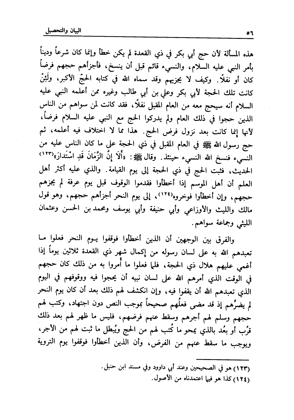 هذه المسألة؛ لأن حج أبي بكر في ذي القعدة لم يكن خطأ وإنما كان شرعا ودينا بأمر النبي - عَلَيْهِ السَّلَامُ -، والنسيء قائم قبل أن ينسخ، فأجزأهم حجهم فرضا كان أو نفلا. وكيف لا يجزيهم وقد سماه الله في كتابه الحج الأكبر، ولئن كانت تلك الحجة لأبي بكر وعلي بن أبي طالب وغيره ممن أعلمه النبي - عَلَيْهِ السَّلَامُ - أنه سيحج معه من العام المقبل نفلا، فقد كانت لمن سواهم من الناس الذين حجوا في ذلك العام ولم يدركوا الحج مع النبي - عَلَيْهِ السَّلَامُ - فرضا؛ لأنها إنما كانت بعد نزول فرض الحج. هذا مما لا اختلاف فيه أعلمه، ثم حج رسول الله - صَلَّى اللَّهُ عَلَيْهِ وَسَلَّمَ - في العام المقبل في ذي الحجة على ما كان الناس عليه من النسيء فنسخ الله النسيء حينئذ. وقال - صَلَّى اللَّهُ عَلَيْهِ وَسَلَّمَ -: «ألا إن الزمان قد استدار» ... الحديث، فثبت الحج في ذي الحجة إلى يوم القيامة. والذي عليه أكثر أهل العلم أن أهل الموسم إذا أخطئوا فقدموا الوقوف قبل يوم عرفة لم يجزهم حجهم، وإن أخطئوا فوخروه، إلى يوم النحر أجزأهم حجهم، وهو قول مالك والليث والأوزاعي وأبي حنيفة وأبي يوسف ومحمد بن الحسن وعثمان الليثي وجماعة سواهم.
