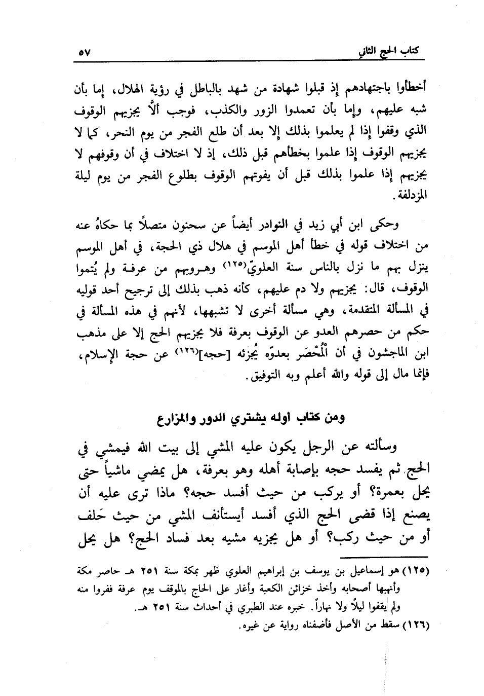 وحكى ابن أبي زيد في النوادر أيضا عن سحنون متصلا بما حكاه عنه من اختلاف قوله في خطأ أهل الموسم في هلال ذي الحجة، في أهل الموسم ينزل بهم ما نزل بالناس سنة العلوي وهروبهم من عرفة ولم يتموا الوقوف، قال: يجزيهم ولا دم عليهم، كأنه ذهب بذلك إلى ترجيح أحد قوليه في المسألة المتقدمة، وهي مسألة أخرى لا تشبهها؛ لأنهم في هذه المسألة في حكم من حصرهم العدو عن الوقوف بعرفة، فلا يجزيهم الحج إلا على مذهب ابن الماجشون في أن المحصر بعدوه يجزئه [حجه] عن حجة الإسلام، فإنما مال إلى قوله، والله أعلم وبه التوفيق.