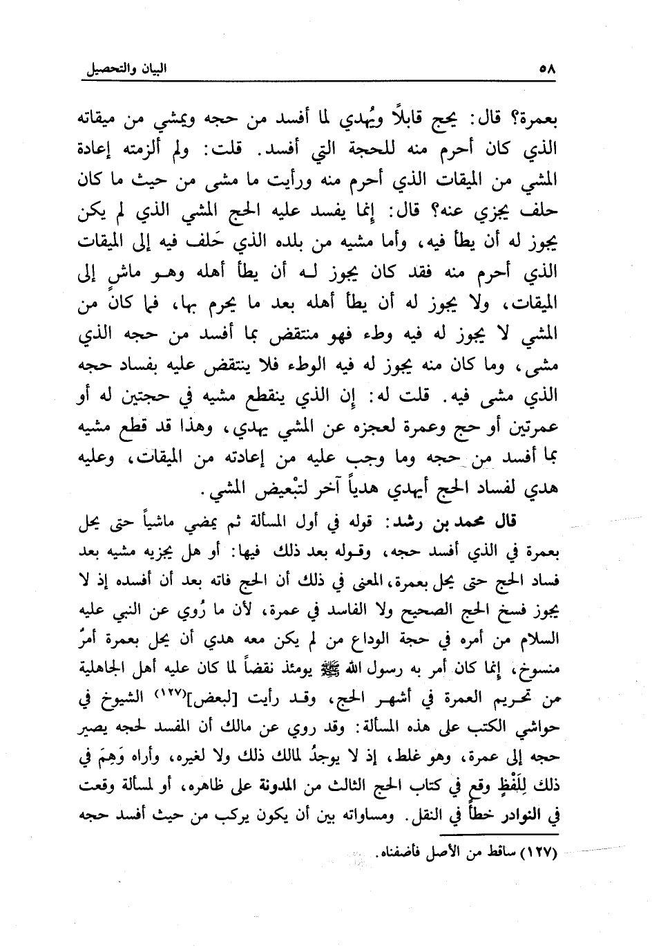 قال محمد بن رشد: قوله في أول المسألة: ثم يمضي ماشيا حتى يحل بعمرة في الذي أفسد حجه، وقوله بعد ذلك فيها: أو هل يجزيه مشيه بعد فساد الحج حتى يحل بعمرة، المعنى في ذلك أن الحج فاته بعد أن أفسده، إذ لا يجوز فسخ الحج الصحيح ولا الفاسد في عمرة؛ لأن ما روي عن النبي - عَلَيْهِ السَّلَامُ - من أمره في حجة الوداع من لم يكن معه هدي أن يحل بعمرة أمر منسوخ، إنما كان أمر به رسول الله - صَلَّى اللَّهُ عَلَيْهِ وَسَلَّمَ - يومئذ نقضا لما كان عليه أهل الجاهلية من تحريم العمرة في أشهر الحج، وقد رأيت [لبعض] الشيوخ في حواشي الكتب على هذه المسألة: وقد روي عن مالك أن المفسد لحجه يصير حجه إلى عمرة، وهو غلط، إذ لا يوجد لمالك ذلك ولا لغيره، وأراه وهم في ذلك للفظ وقع في كتاب الحج الثالث من المدونة على ظاهره، أو لمسألة وقعت في النوادر خطأ في النقل. ومساواته بين أن يكون يركب من حيث أفسد حجه