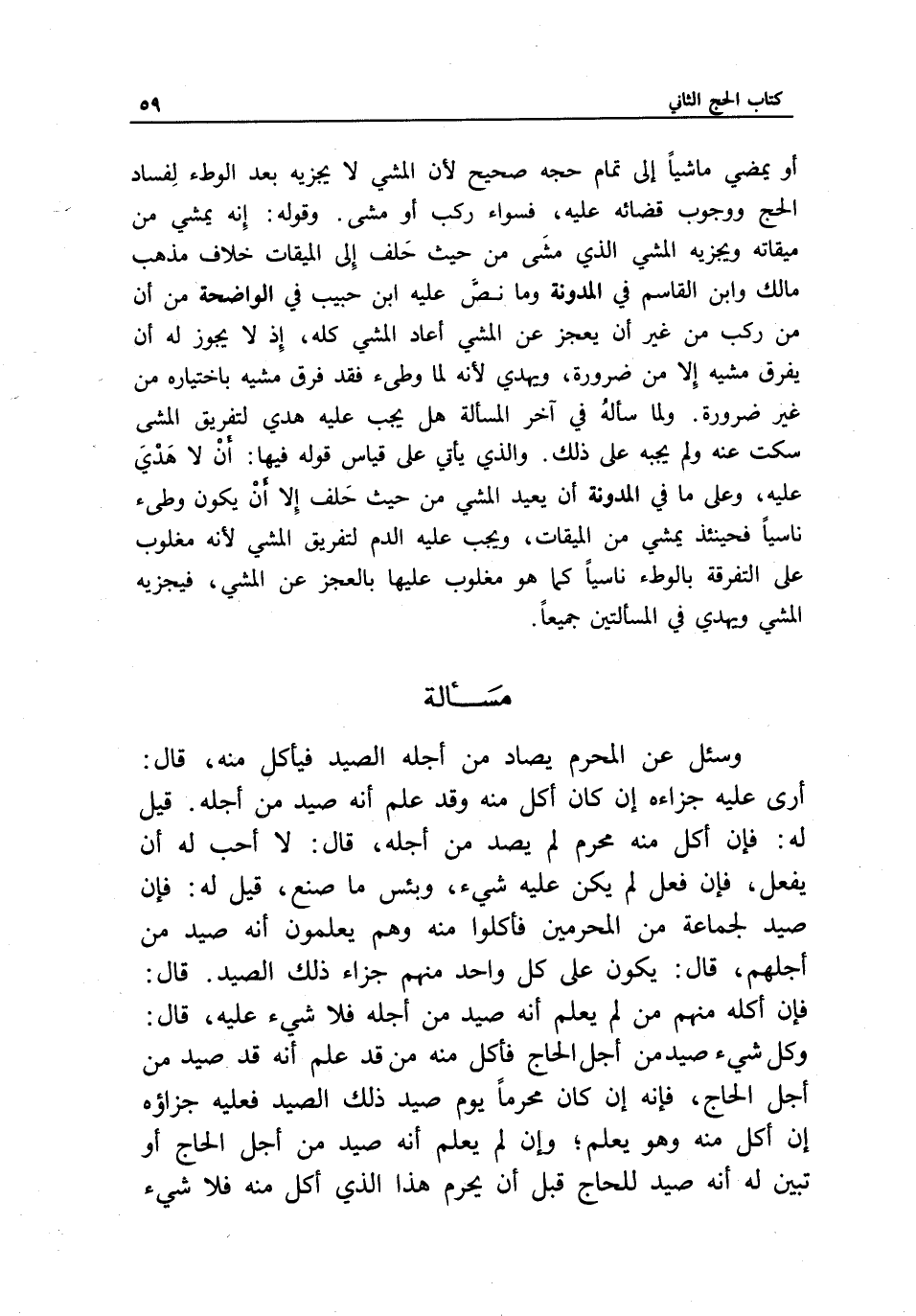 مسألة وسئل: عن المحرم يصاد من أجله الصيد فيأكل منه، قال: أرى عليه جزاءه إن كان أكل منه وقد علم أنه صيد من أجله. قيل له: فإن أكل منه محرم لم يصد من أجله، قال: لا أحب له أن يفعل، فإن فعل لم يكن عليه شيء، وبئس ما صنع، قيل له: فإن صيد لجماعة من المحرمين فأكلوا منه وهم يعلمون أنه صيد من أجلهم، قال: يكون على كل واحد منهم جزاء ذلك الصيد. قال: فإن أكله منهم من لم يعلم أنه صيد من أجله فلا شيء عليه، قال: وكل شيء صيد من أجل الحاج فأكل منه من قد علم أنه قد صيد من أجل الحاج، فإنه إن كان محرما يوم صيد ذلك الصيد فعليه جزاؤه إن أكل منه وهو يعلم؛ وإن لم يعلم أنه صيد من أجل الحاج أو تبين له أنه صيد للحاج قبل أن يحرم هذا الذي أكل منه فلا شيء