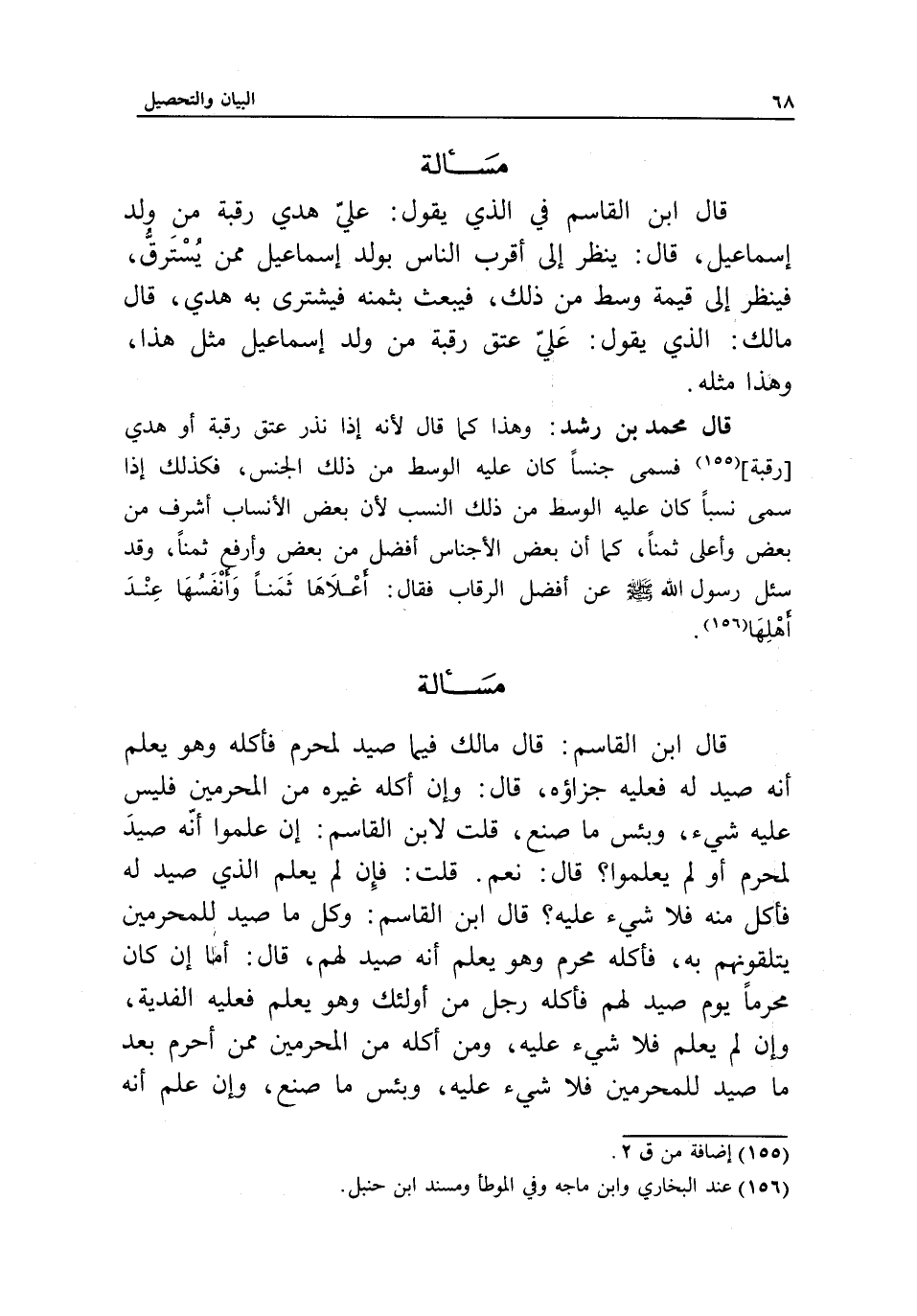 مسألة قال ابن القاسم في الذي يقول: علي هدي رقبة من ولد إسماعيل، قال: ينظر إلى أقرب الناس بولد إسماعيل ممن يسترق، فينظر إلى قيمة وسط من ذلك، فيبعث بثمنه فيشترى به هدي، قال مالك: الذي يقول: علي عتق رقبة من ولد إسماعيل مثل هذا، وهذا مثله.