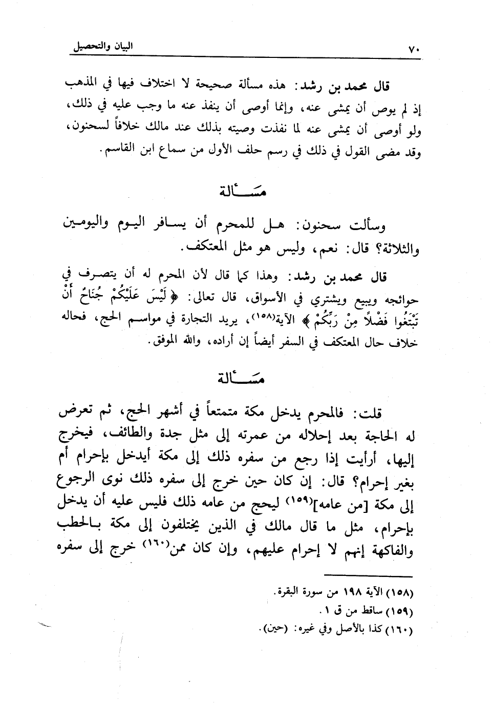 قال محمد بن رشد: وهذا كما قال؛ لأن المحرم له أن يتصرف في حوائجه ويبيع ويشتري في الأسواق، قال تعالى: {لَيْسَ عَلَيْكُمْ جُنَاحٌ أَنْ تَبْتَغُوا فَضْلا مِنْ رَبِّكُمْ} [البقرة: 198] الآية، يريد التجارة في مواسم الحج، فحاله خلاف حال المعتكف في السفر أيضا إن أراده، والله الموفق.