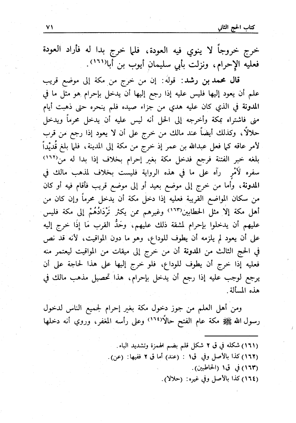 قال محمد بن رشد: قوله: إن من خرج من مكة إلى موضع قريب علم أن يعود إليها فليس عليه إذا رجع إليها أن يدخل بإحرام هو مثل ما في المدونة في الذي كان عليه هدي من جزاء صيده فلم ينحره حتى ذهبت أيام منى فاشتراه بمكة وأخرجه إلى الحل أنه ليس عليه أن يدخل محرما ويدخل حلالا، وكذلك أيضا عند مالك من خرج على أن لا يعود إذا رجع من قرب لأمر عاقه؛ كما فعل عبد الله بن عمر: إذ خرج من مكة إلى المدينة، فلما بلغ قديدا بلغه خبر الفتنة فرجع فدخل مكة بغير إحرام، بخلاف إذا بدا له من سفره لأمر رآه، على ما في هذه الرواية فليست بخلاف لمذهب مالك في المدونة، وأما من خرج إلى موضع بعيد أو إلى موضع قريب فأقام فيه أو كان من سكان المواضع القريبة فعليه إذا دخل مكة أن يدخل محرما وإن كان من أهل مكة إلا مثل الحطابين وغيرهم ممن يكثر تردادهم إلى مكة فليس عليهم أن يدخلوا بإحرام لمشقة ذلك عليهم، وحد القرب ما إذا خرج إليه على أن يعود لم يلزمه أن يطوف للوداع، وهو ما دون المواقيت؛ لأنه قد نص في الحج الثالث من المدونة أن من خرج إلى ميقات من المواقيت ليعتمر منه فعليه إذا خرج أن يطوف للوداع، فلو خرج إليها على هذا لحاجة على أن يرجع لوجب عليه إذا رجع أن يدخل بإحرام، هذا تحصيل مذهب مالك في هذه المسألة.