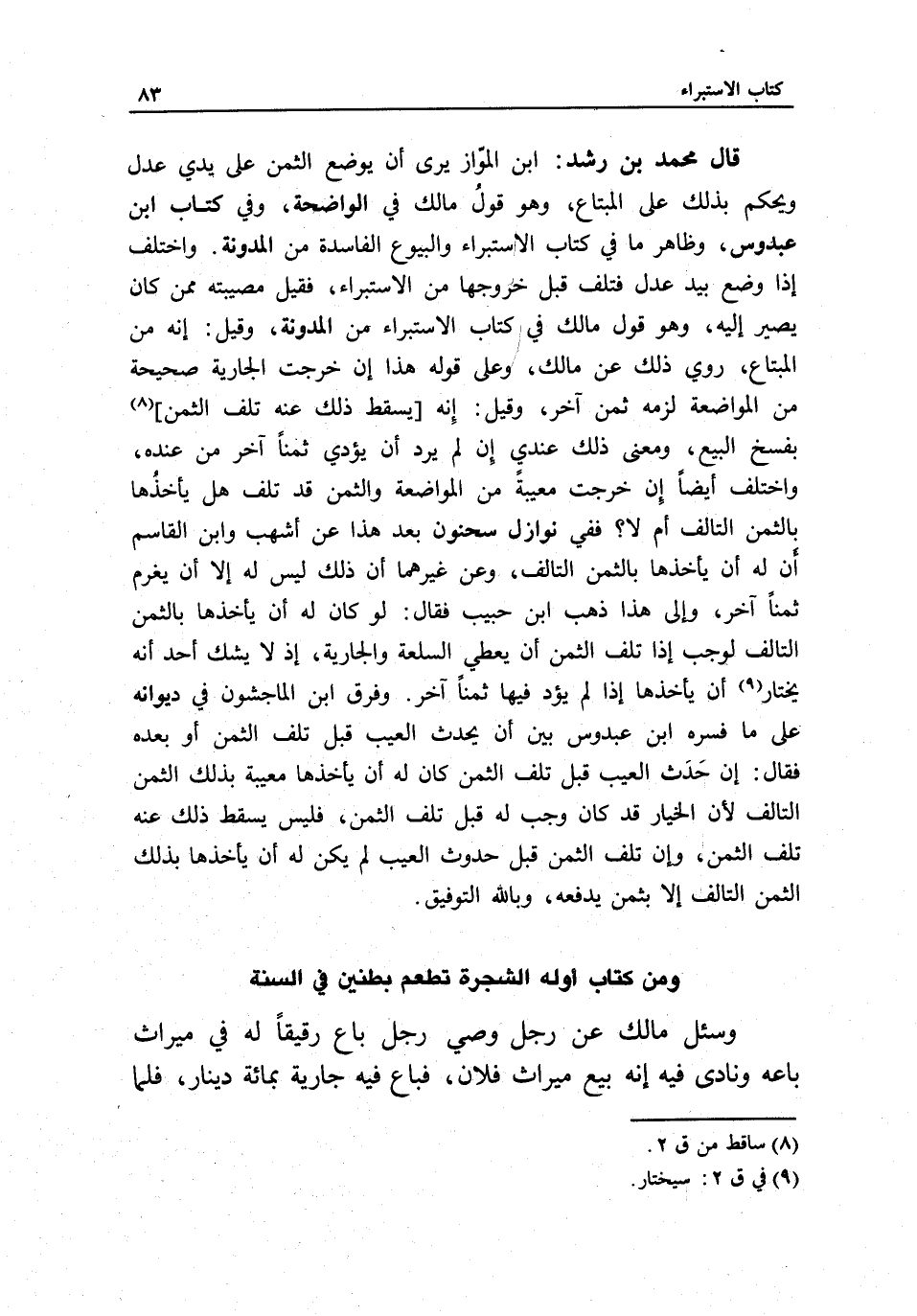 ومن كتاب أوله الشجرة تطعم بطنين في السنة وسئل مالك: عن رجل وصي رجل باع رقيقا له في ميراث باعه ونادى فيه إنه بيع ميراث فلان، فباع فيه جارية بمائة دينار، فلما