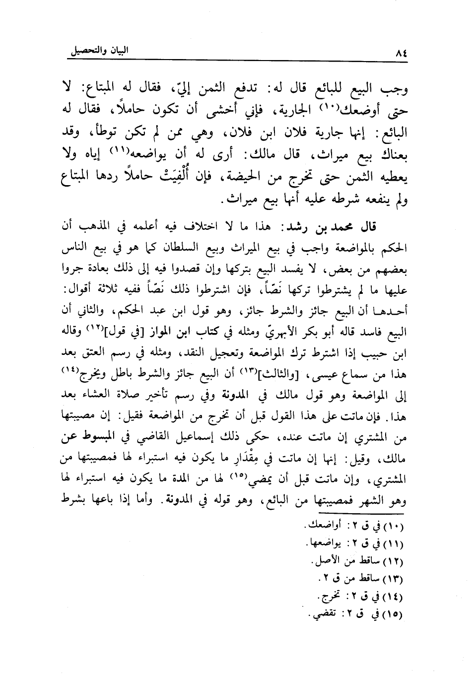 قال محمد بن رشد: هذا ما لا اختلاف فيه أعلمه في المذهب أن الحكم بالمواضعة واجب في بيع الميراث وبيع السلطان كما هو في بيع الناس بعضهم من بعض، لا يفسد البيع بتركها وإن قصدوا فيه إلى ذلك بعادة جروا عليها ما لم يشترطوا تركها نصا، فإن اشترطوا ذلك نصا ففيه ثلاثة أقوال: أحدها: أن البيع جائز والشرط جائز، وهو قول ابن عبد الحكم، والثاني: أن البيع فاسد، قاله أبو بكر الأبهري، ومثله في كتاب ابن المواز [في قول،] وقاله ابن حبيب إذا اشترط ترك المواضعة وتعجيل النقد، ومثله في رسم العتق بعد هذا من سماع عيسى، [والثالث:] أن البيع جائز والشرط باطل ويخرج إلى المواضعة، وهو قول مالك في المدونة، وفي رسم تأخير صلاة العشاء بعد هذا. فإن ماتت على هذا القول قبل أن تخرج من المواضعة، فقيل: إن مصيبتها من المشتري إن ماتت عنده، حكى ذلك إسماعيل القاضي في المبسوط عن مالك، وقيل: إنها إن ماتت في مقدار ما يكون فيه استبراء لها فمصيبتها من المشتري، وإن ماتت قبل أن يمضي لها من المدة ما يكون فيه استبراء لها، وهو الشهر فمصيبتها من البائع، وهو قوله في المدونة. وأما إذا باعها بشرط