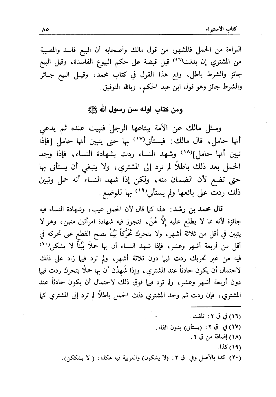 ومن كتاب أوله سن رسول الله - صَلَّى اللَّهُ عَلَيْهِ وَسَلَّمَ - وسئل مالك: عن الأمة يبتاعها الرجل فتبيت عنده ثم يدعي أنها حامل، قال مالك: فيستأني بها حتى يتبين أنها حامل، [فإذا يتبين أنها حامل] وشهد النساء ردت بشهادة النساء، فإذا وجد الحمل بعد ذلك باطلا لم ترد إلى المشتري، ولا ينبغي أن يستأنى بها حتى تضع؛ لأن الضمان منه، ولكن إذا شهد النساء أنه حمل وتبين ذلك ردت على بائعها ولم يستأني بها للوضع.