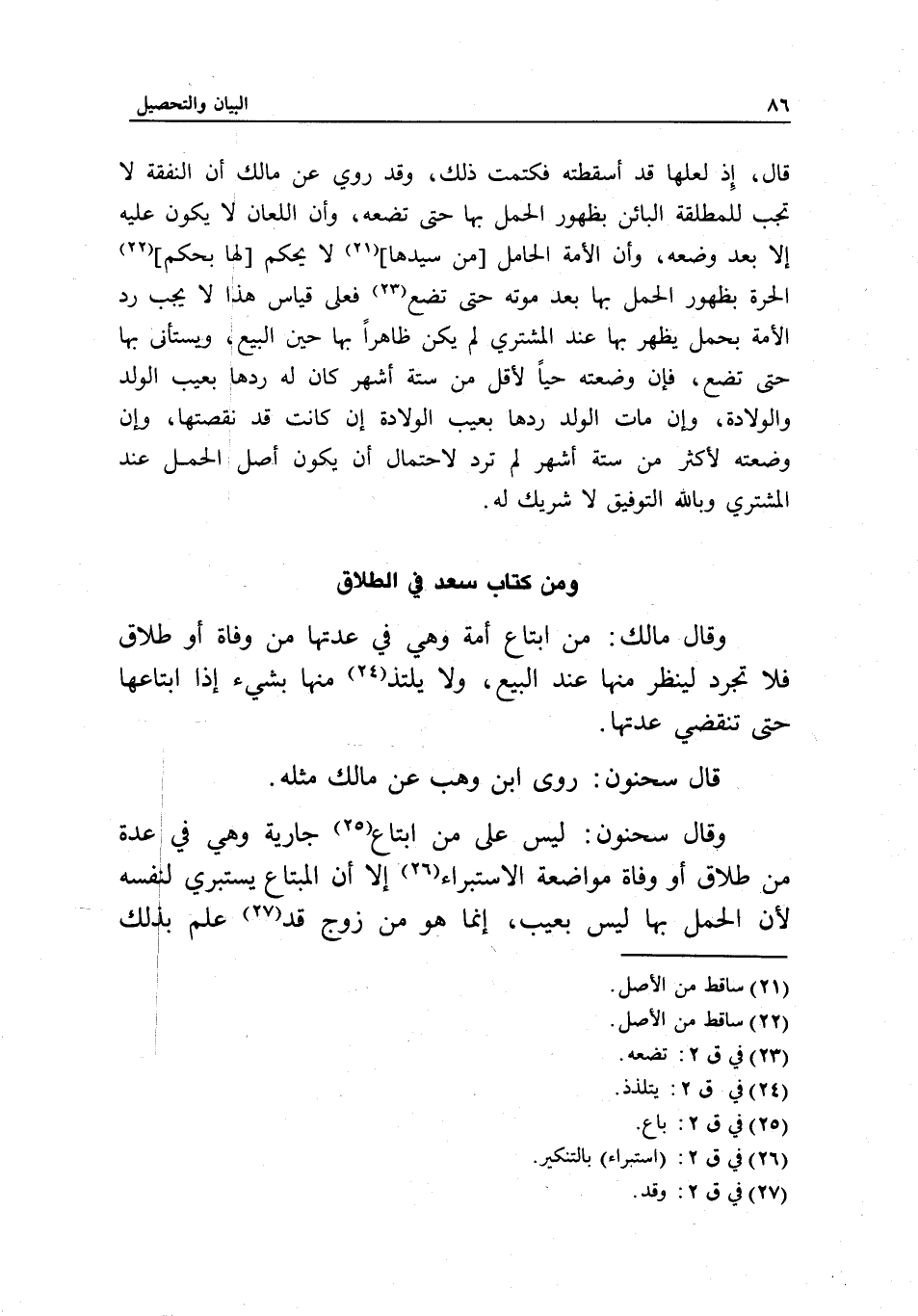 قال، إذ لعلها قد أسقطته فكتمت ذلك، وقد روي عن مالك أن النفقة لا تجب للمطلقة البائن بظهور الحمل بها حتى تضعه، وأن اللعان لا يكون عليه إلا بعد وضعه، وأن الأمة الحامل [من سيدها] لا يحكم [لها بحكم] الحرة بظهور الحمل بها بعد موته حتى تضع، فعلى قياس هذا لا يجب رد الأمة بحمل يظهر بها عند المشتري لم يكن ظاهرا بها حين البيع، ويستأنى بها حتى تضع، فإن وضعته حيا لأقل من ستة أشهر كان له ردها بعيب الولد والولادة، وإن مات الولد ردها بعيب الولادة إن كانت قد نقصتها، وإن وضعته لأكثر من ستة أشهر لم ترد لاحتمال أن يكون أصل الحمل عند المشتري، وبالله التوفيق لا شريك له.