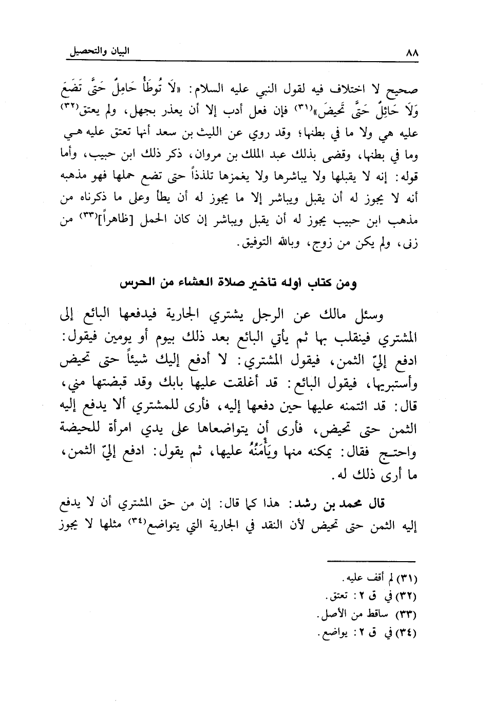 ومن كتاب أوله تأخير صلاة العشاء من الحرس وسئل مالك: عن الرجل يشتري الجارية فيدفعها البائع إلى المشتري فينقلب بها ثم يأتي البائع بعد ذلك بيوم أو يومين، فيقول: ادفع إلي الثمن، فيقول المشترى: لا أدفع إليك شيئا حتى تحيض وأستبريها، فيقول البائع: قد أغلقت عليها بابك وقد قبضتها مني، قال: قد ائتمنه عليها حين دفعها إليه، فأرى للمشتري ألا يدفع إليه الثمن حتى تحيض، فأرى أن يتواضعاها على يدي امرأة للحيضة، واحتج فقال: يمكنه منها ويأمنه عليها، ثم يقول: ادفع إلي الثمن، ما أرى ذلك له.