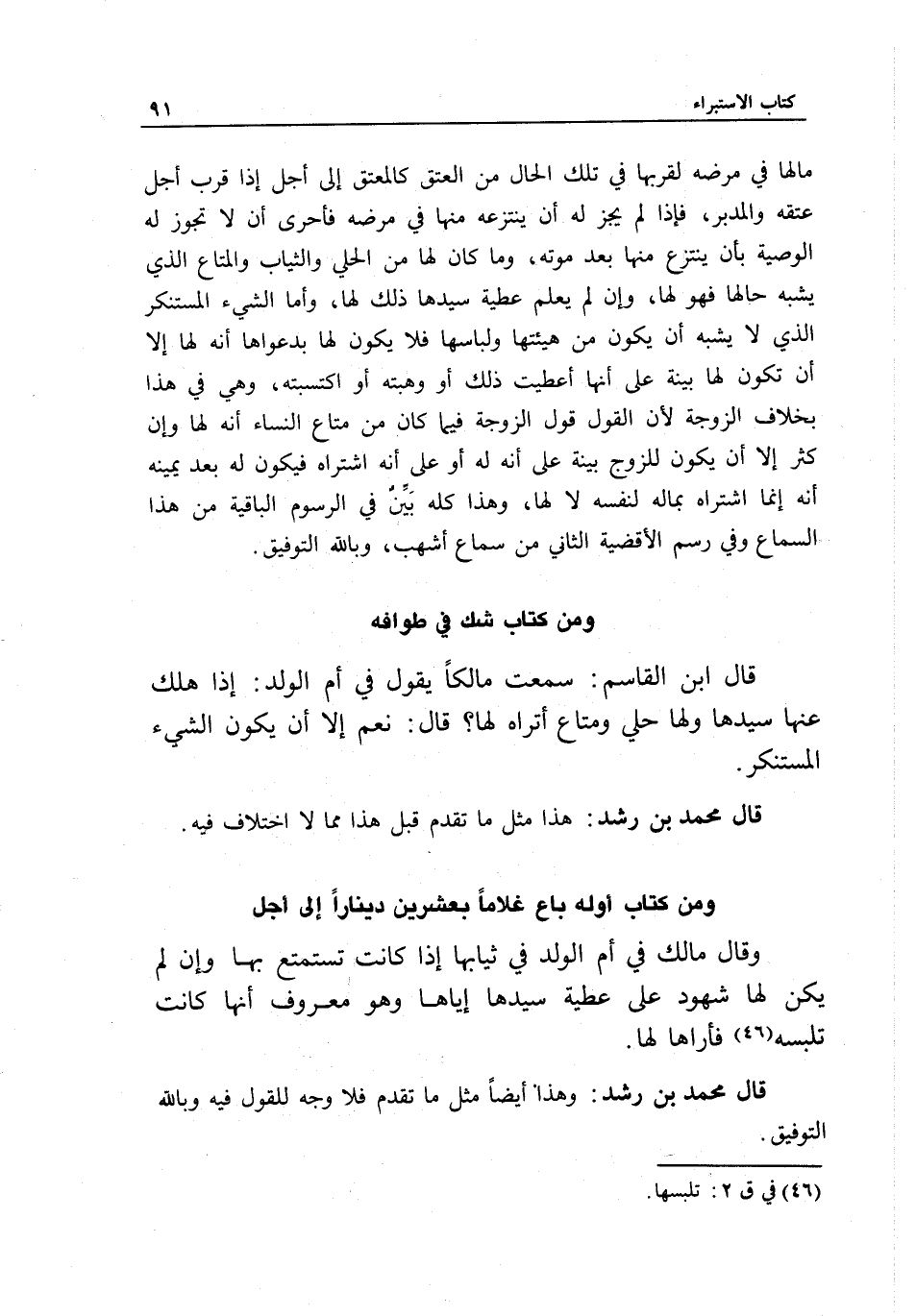ومن كتاب أوله باع غلاما بعشرين دينارا إلى أجل وقال مالك في أم الولد في ثيابها إذا كانت تستمتع بها وإن لم يكن لها شهود على عطية سيدها إياها وهو معروف أنها كانت تلبسه فأراها لها.