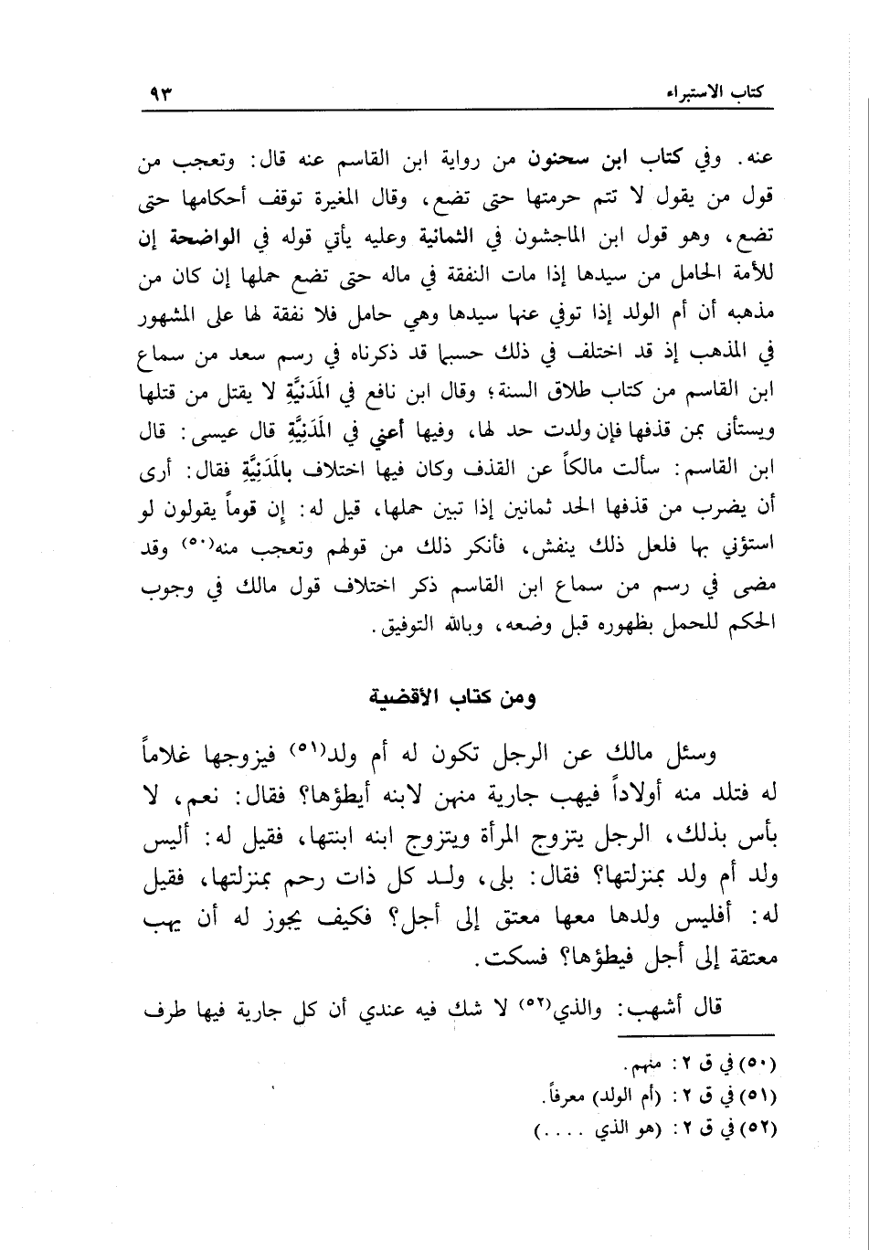 ومن كتاب الأقضية وسئل مالك: عن الرجل تكون له أم ولد، فيزوجها غلاما له، فتلد منه أولادا فيهب جارية منهن لابنه، أيطؤها؟ فقال: نعم، لا بأس بذلك، الرجل يتزوج المرأة ويتزوج ابنه ابنتها، فقيل له: أليس ولد أم ولد بمنزلتها؟ فقال: بلى، ولد كل ذات رحم بمنزلتها، فقيل له: أفليس ولدها معها معتق إلى أجل؟ فكيف يجوز له أن يهب معتقة إلى أجل فيطؤها؟ فسكت.