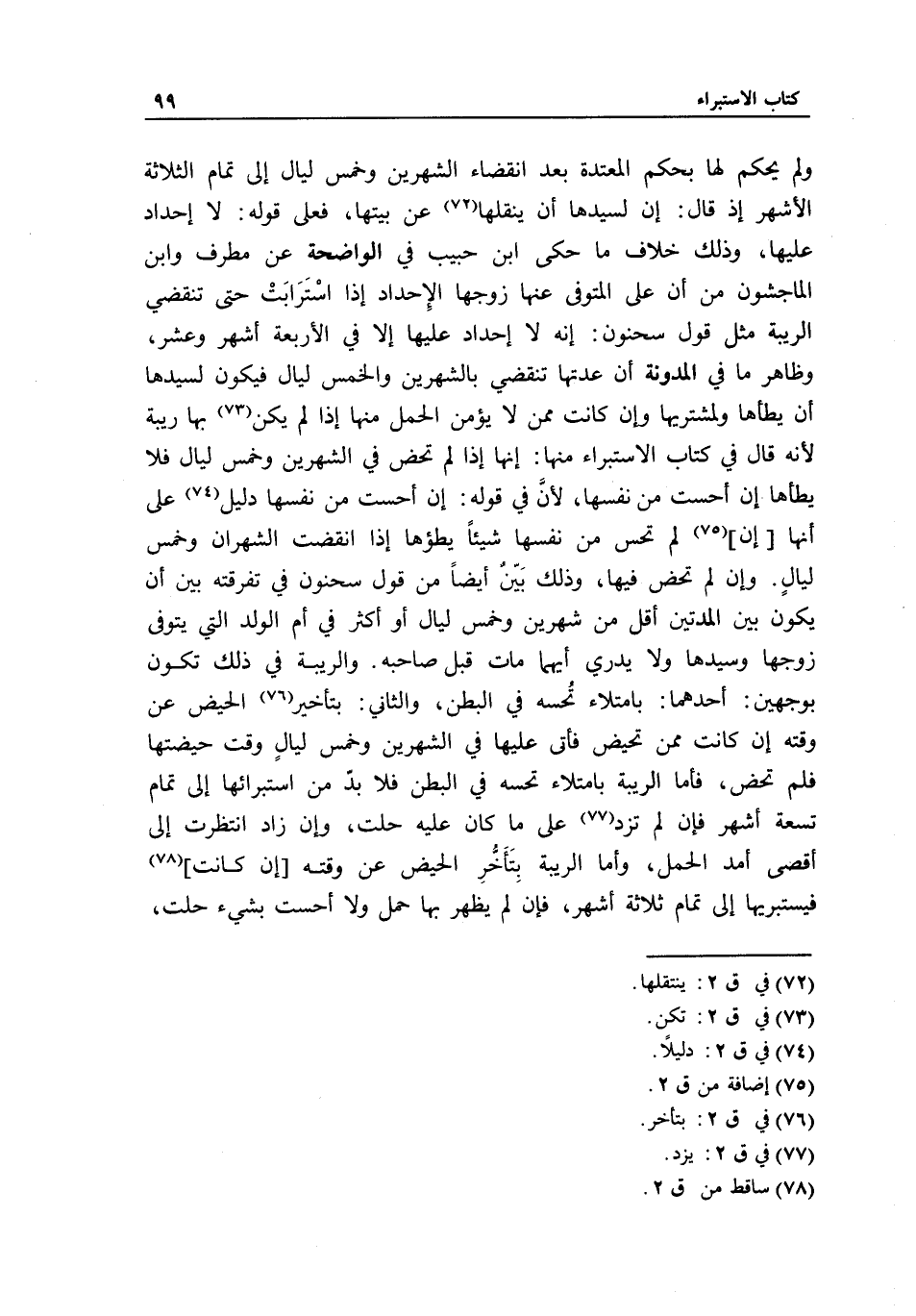 ولم يحكم لها بحكم المعتدة بعد انقضاء الشهرين وخمس ليال إلى تمام الثلاثة الأشهر، إذ قال: إن لسيدها أن ينقلها عن بيتها، فعلى قوله: لا إحداد عليها، وذلك خلاف ما حكى ابن حبيب في الواضحة عن مطرف وابن الماجشون: من أن على المتوفى عنها زوجها الإحداد إذا استرابت حتى تنقضي الريبة، مثل قول سحنون: إنه لا إحداد عليها إلا في الأربعة أشهر وعشر، وظاهر ما في المدونة: أن عدتها تنقضي بالشهرين والخمس ليال، فيكون لسيدها أن يطأها ولمشتريها وإن كانت ممن لا يؤمن الحمل منها، إذا لم يكن بها ريبة؛ لأنه قال في كتاب الاستبراء منها: إنها إذا لم تحض في الشهرين وخمس ليال فلا يطأها إن أحست من نفسها؛ لأن في قوله "إن أحست من نفسها" دليل على أنها [إن] لم تحس من نفسها شيئا، يطؤها إذا انقضت الشهران وخمس ليال. وإن لم تحض فيها، وذلك بين أيضا من قول سحنون في تفرقته بين أن يكون بين المدتين أقل من شهرين وخمس ليال أو أكثر في أم الولد التي يتوفى زوجها وسيدها، ولا يدري أيهما مات قبل صاحبه. والريبة في ذلك تكون بوجهين: أحدهما: بامتلاء تحسه في البطن، والثاني: بتأخير الحيض عن وقته، إن كانت ممن تحيض، فأتى عليها في الشهرين وخمس ليال وقت حيضتها فلم تحض، فأما الريبة بامتلاء تحسه في البطن فلا بد من استبرائها إلى تمام تسعة أشهر، فإن لم تزد على ما كان عليه حلت، وإن زاد انتظرت إلى أقصى أمد الحمل، وأما الريبة بتأخر الحيض عن وقته [إن كانت،] فيستبريها إلى تمام ثلاثة أشهر، فإن لم يظهر بها حمل ولا أحست بشيء حلت.