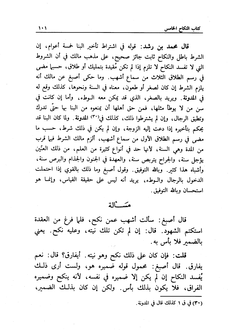 قلت: فإن كان على ذلك نكح وهو نيته. أيفارق؟ قال: نعم يفارق. قال أصبغ: محمول قوله ضميره هو، ولست أرى ذلك يُفسد النكاح إن لم يكن إلا ضميره في نفسه؛ لأنه ينكح وضميره الفراق، فلا يكون بذلك بأس. ولكن إن كان بذلك الضمير،