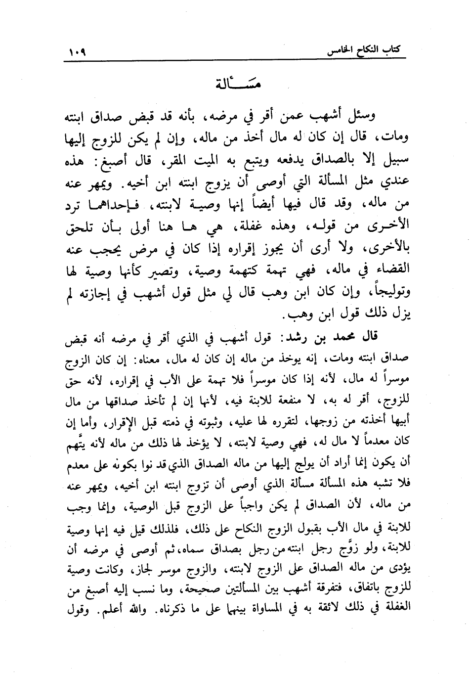 مسألة وسئل أشهب عمن أقر في مرضه، بأنه قد قبض صداق ابنته ومات، قال: إن كان له مال أخذ من ماله، وإن لم يكن للزوج إليها سبيل إلا بالصداق يدفعه ويتبع به الميت المقر، قال أصبغ: هذه عندي مثل المسألة التي أوصى أن يزوج ابنته ابن أخيه. ويمهر عنه من ماله، وقد قال فيها أيضا إنها وصية لابنته، فإحداهما ترد الأخرى من قوله، وهذه غفلة، هي ها هنا أولى بأن تلحق بالأخرى، ولا أرى أن يجوز إقراره إذا كان في مرض يحجب عنه القضاء في ماله، فهي تهمة كتهمة وصية، وتصير كأنها وصية لها وتوليجا، وإن كان ابن وهب قال لي مثل قول أشهب في إجازته لم يزل ذلك قول ابن وهب.