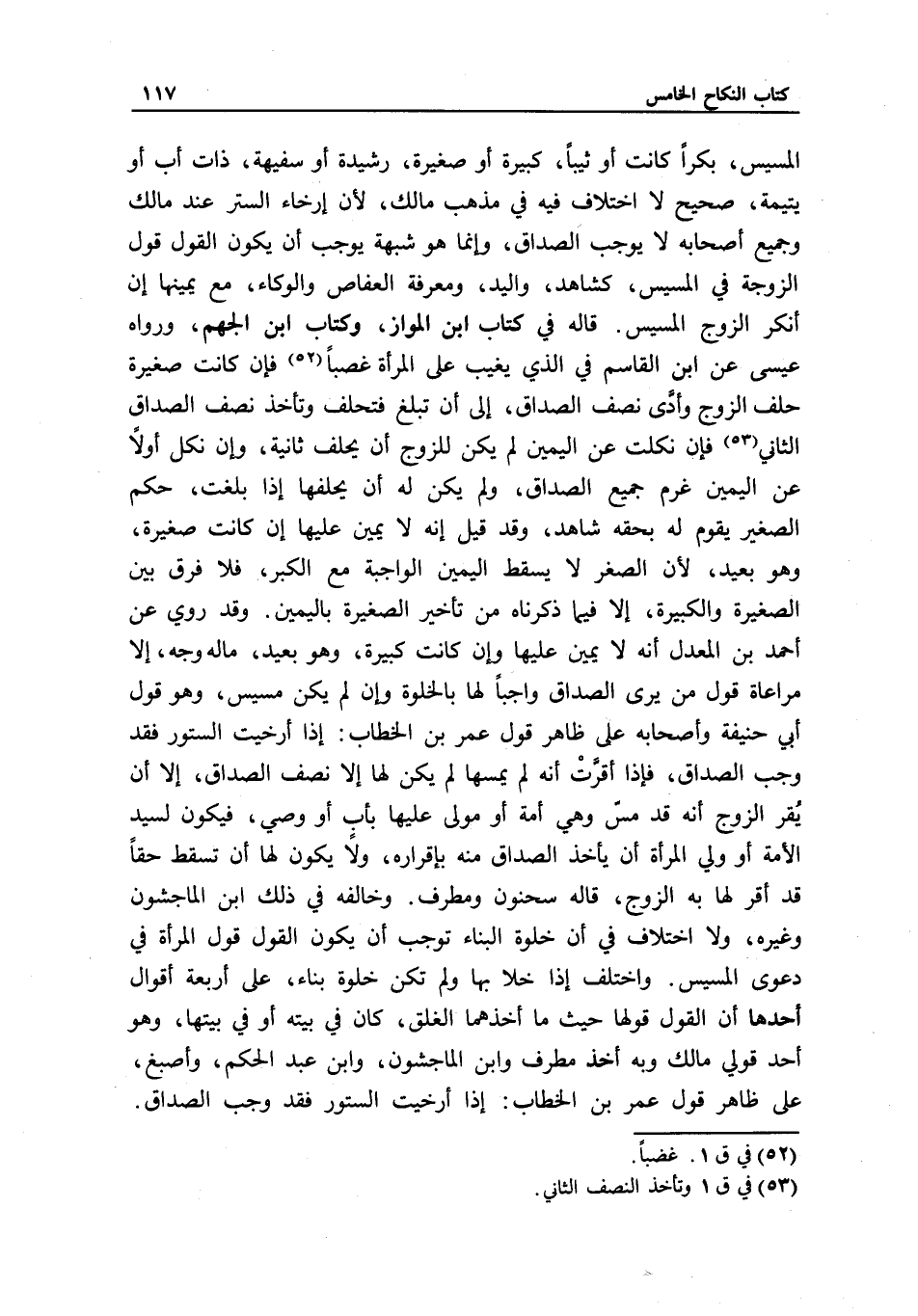 المسيس، بكرا كانت أو ثيبا، كبيرة أو صغيرة، رشيدة أو سفيهة، ذات أب أو يتيمة، صحيح لا اختلاف فيه في مذهب مالك؛ لأن إرخاء الستر عند مالك وجميع أصحابه لا يوجب الصداق، وإنما هو شبهة يوجب أن يكون القول قول الزوجة في المسيس، كشاهد، واليد، ومعرفة العفاص والوكاء، مع يمينها إن أنكر الزوج المسيس. قاله في كتاب ابن المواز، وكتاب ابن الجهم، ورواه عيسى عن ابن القاسم في الذي يغيب على المرأة غصبا، فإن كانت صغيرة حلف الزوج وأدَّى نصف الصداق، إلى أن تبلغ فتحلف وتأخذ نصف الصداق الثاني، فإن نكلت عن اليمين لم يكن للزوج أن يحلف ثانية، وإن نكل أولا عن اليمين غرم جميع الصداق، ولم يكن له أن يحلفها إذا بلغت، حكم الصغير يقوم له بحقه شاهد، وقد قيل إنه لا يمين عليها إن كانت صغيرة، وهو بعيد؛ لأن الصغر لا يسقط اليمين الواجبة مع الكبر، فلا فرق بين الصغيرة والكبيرة، إلا فيما ذكرناه من تأخير الصغيرة باليمين. وقد روي عن أحمد بن المعدل أنه لا يمين عليها وإن كانت كبيرة، وهو بعيد، ما له وجه، إلا مراعاة قول من يرى الصداق واجبا لها بالخلوة وإن لم يكن مسيس، وهو قول أبي حنيفة وأصحابه على ظاهر قول عمر بن الخطاب: إذا أرخيت الستور فقد وجب الصداق، فإذا أقرت أنه لم يمسها لم يكن لها إلا نصف الصداق، إلا أن يُقر الزوج أنه قد مس وهي أمة أو مولى عليها بأب أو وصي، فيكون لسيد الأمة أو ولي المرأة أن يأخذ الصداق منه بإقراره، ولا يكون لها أن تسقط حقا قد أقر لها به الزوج، قاله سحنون ومطرف. وخالفه في ذلك ابن الماجشون وغيره، ولا اختلاف في أن خلوة البناء توجب أن يكون القول قول المرأة في دعوى المسيس. واختلف إذا خلا بها ولم تكن خلوة بناء، على أربعة أقوال: أحدها: أن القول قولها حيث ما أخذهما الغلق، كان في بيته أو في بيتها، وهو أحد قولي مالك وبه أخذ مطرف وابن الماجشون، وابن عبد الحكم، وأصبغ، على ظاهر قول عمر بن الخطاب: إذا أرخيت الستور فقد وجب الصداق.