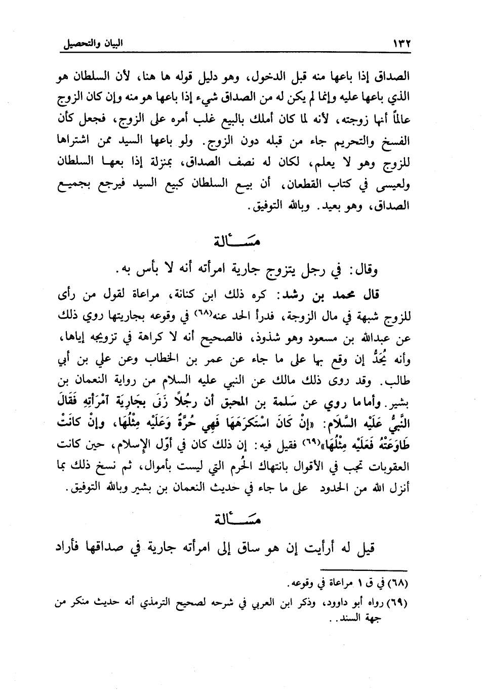 قال محمد بن رشد: كره ذلك ابن كنانة، مراعاة لقول من رأى للزوج شبهة في مال الزوجة، فدرأ الحد عنه في وقوعه بجاريتها، روي ذلك عن عبد الله بن مسعود وهو شذوذ، فالصحيح أنه لا كراهة في تزويجه إياها، وأنه يحد إن وقع بها على ما جاء عن عمر بن الخطاب، وعن علي بن أبي طالب، وقد روى ذلك مالك، عن النبي - عَلَيْهِ السَّلَامُ - من رواية النعمان بن بشير. وأما ما روي عن سلمة بن المحبق: «أن رجلا زنى بجارية امرأته، فقال النبي - عَلَيْهِ السَّلَامُ -: "إن كان استكرهها، فهي حرة، وعليه مثلها، وإن كانت طاوعته فعليه مثلها» فقيل فيه: إن ذلك كان في أول الإسلام، حين كانت العقوبات تجب في الأقوال بانتهاك الحرم التي ليست بأموال، ثم نسخ ذلك بما أنزل الله من الحدود على ما جاء في حديث النعمان بن بشير، وبالله التوفيق.