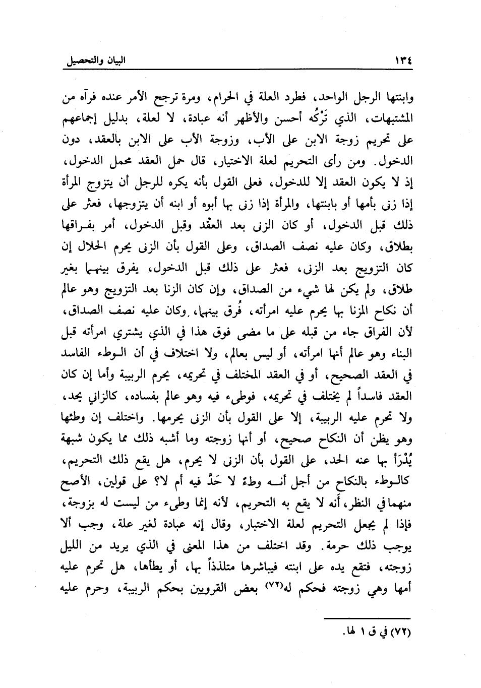 وابنتها الرجل الواحد، فطرد العلة في الحرام، ومرة ترجح الأمر عنده، فرآه من المشتبهات، الذي تركه أحسن، والأظهر أنه عبادة، لا لعلة، بدليل إجماعهم على تحريم زوجة الابن على الأب، وزوجة الأب على الابن بالعقد، دون الدخول. ومن رأى التحريم لعلة الاختيار، قال: حمل العقد محمل الدخول؛ إذ لا يكون العقد إلا للدخول، فعلى القول بأنه يكره للرجل أن يتزوج المرأة إذا زنى بأمها أو بابنتها، والمرأة إذا زنى بها أبوه أو ابنه أن يتزوجها، فعثر على ذلك قبل الدخول، أو كان الزنا بعد العقد وقبل الدخول، أمر بفراقها بطلاق، وكان عليه نصف الصداق، وعلى القول بأن الزنا يحرم الحلال إن كان التزويج بعد الزنا، فعثر على ذلك قبل الدخول، يفرق بينهما بغير طلاق، ولم يكن لها شيء من الصداق، وإن كان الزنا بعد التزويج، وهو عالم أن نكاح المزني بها يحرم عليه امرأته، فرق بينهما، وكان عليه نصف الصداق؛ لأن الفراق جاء من قبله على ما مضى فوق هذا في الذي يشتري امرأته قبل البناء، وهو عالم أنها امرأته، أو ليس بعالم، ولا اختلاف في أن الوطء الفاسد في العقد الصحيح، أو في العقد المختلف في تحريمه، يحرم الربيبة، وأما إن كان العقد فاسدا لم يختلف في تحريمه، فوطئ فيه وهو عالم بفساده، كالزاني يحد، ولا تحرم عليه الربيبة، إلا على القول بأن الزنا يحرمها.