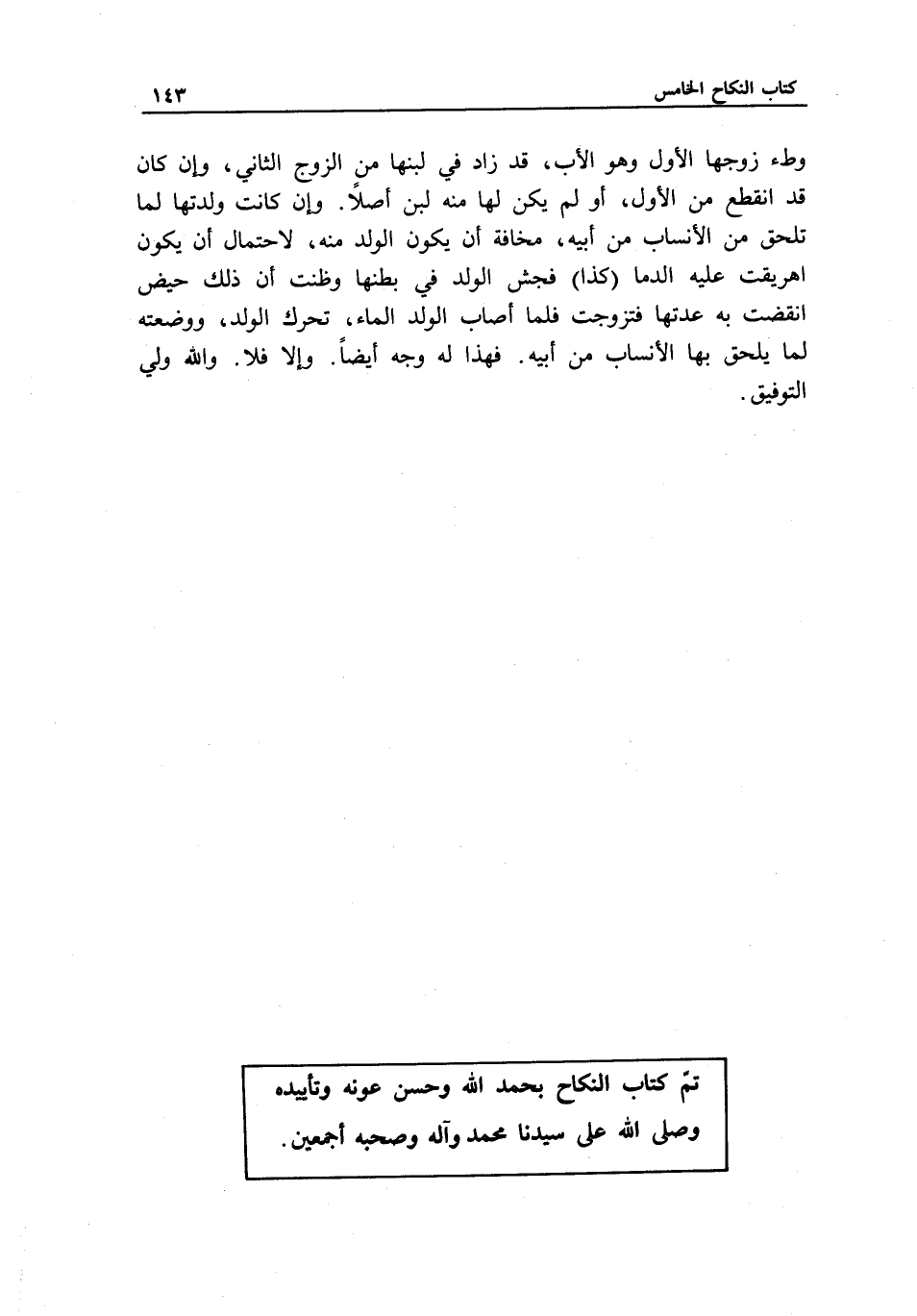 تم كتاب النكاح بحمد الله وحسن عونه وتأييده، وصلى الله على سيدنا محمد وآله وصحبه أجمعين.