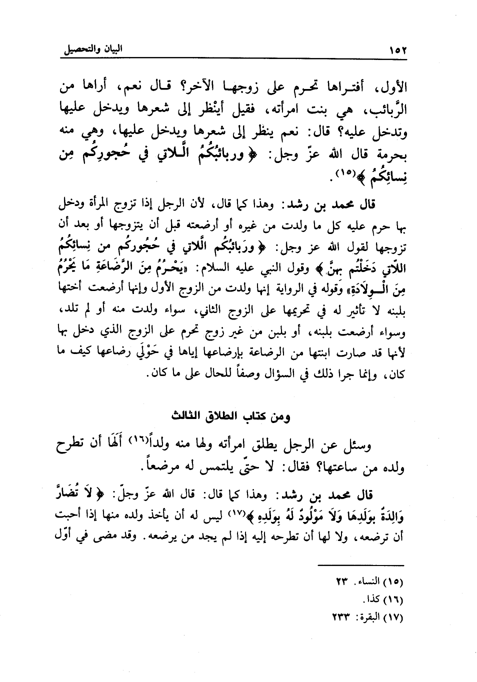 قال محمد بن رشد: وهذا كما قال؛ قال الله عز وجل: {لا تُضَارَّ وَالِدَةٌ بِوَلَدِهَا وَلا مَوْلُودٌ لَهُ بِوَلَدِهِ} [البقرة: 233] ليس له أن يأخذ ولده منها إذا أحبت أن ترضعه، ولا لها أن تطرحه إليه إذا لم يجد من يرضعه، وقد مضى في أول