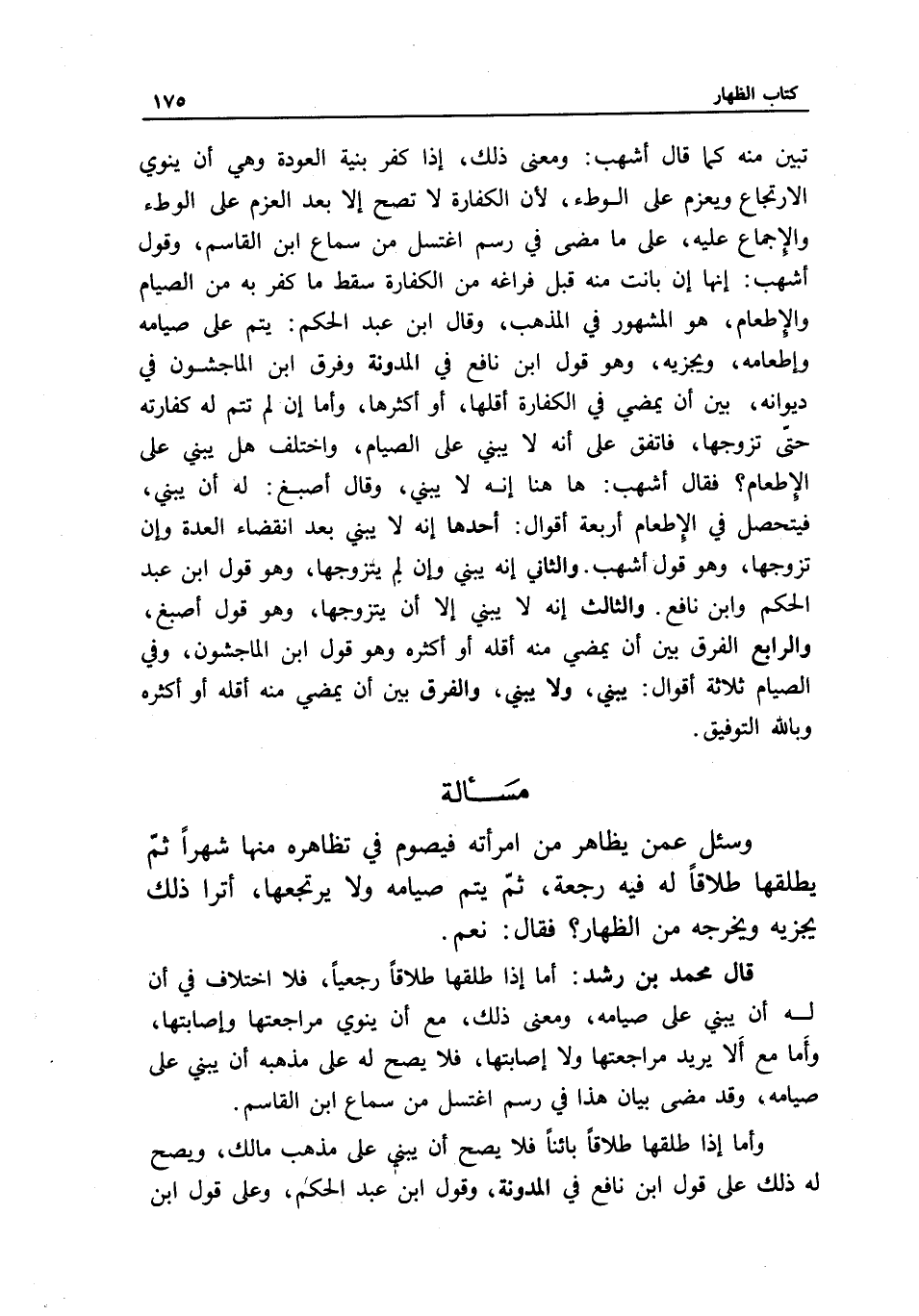 مسألة وسئل عمن يظاهر من امرأته، فيصوم في تظاهره منها شهرا، ثم يطلقها طلاقا له فيه رجعة، ثم يتم صيامه ولا يرتجعها، أترى ذلك يجزيه ويخرجه من الظهار؟ فقال: نعم.