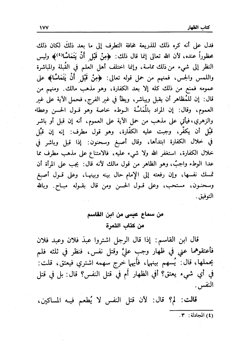فدل على أنه كره ذلك للذريعة، مخافة التطرف إلى ما بعد ذلك لكان ذلك محظورا عنده؛ لأن الله تعالى إنما قال ذلك: {مِنْ قَبْلِ أَنْ يَتَمَاسَّا} [المجادلة: 3] وليس النظر إلى شيء من ذلك مماسة، وإنما اختلف أهل العلم في القبلة والمباشرة واللمس والجس، فمنهم من حمل قَوْله تَعَالَى: {مِنْ قَبْلِ أَنْ يَتَمَاسَّا} [المجادلة: 3] على عمومه، فمنع من ذلك كله إلا بعد الكفارة، وهو مذهب مالك.