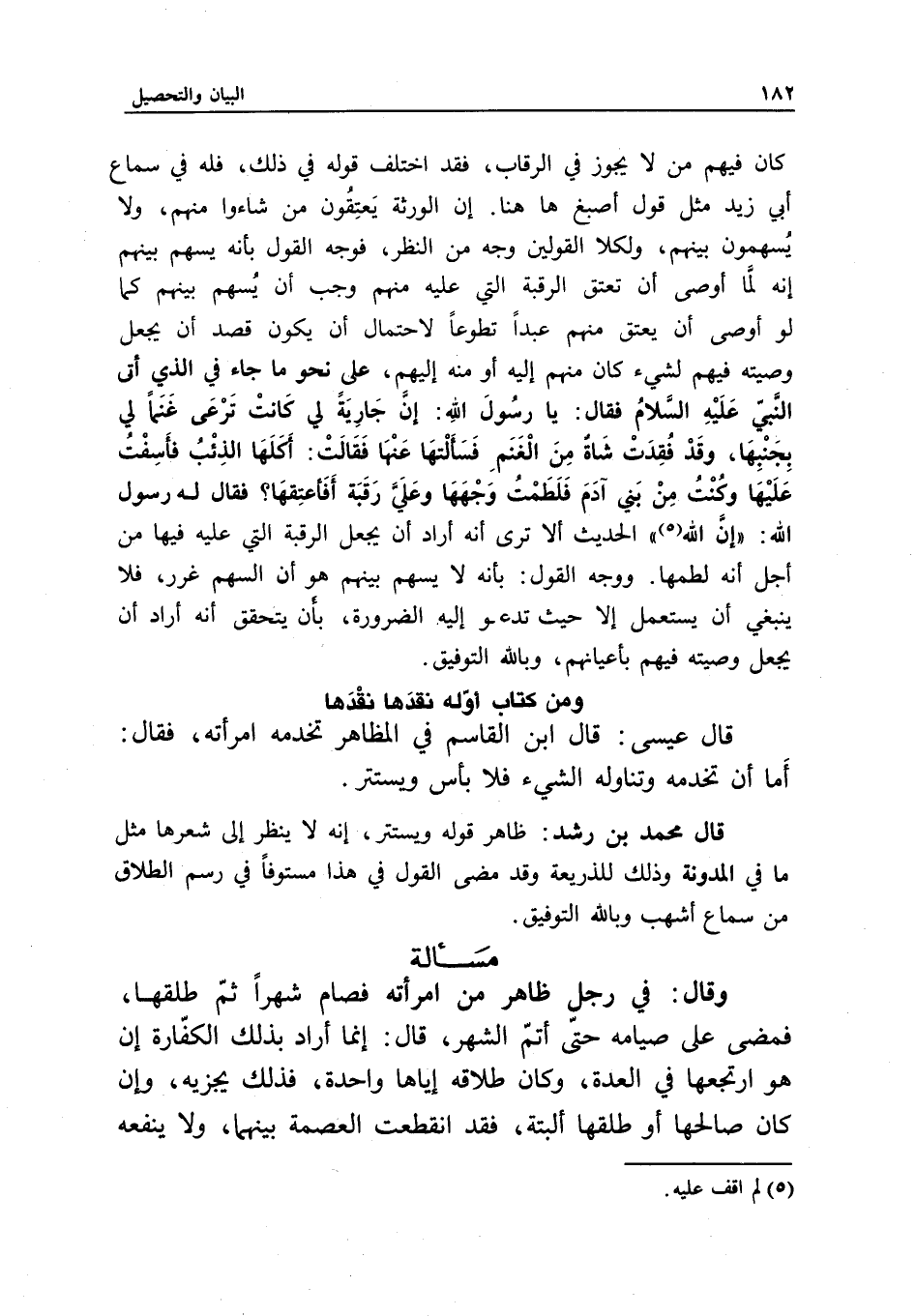 كان فيهم من لا يجوز في الرقاب، فقد اختلف قوله في ذلك، فله في سماع أبي زيد مثل قول أصبغ هاهنا: إن الورثة يعتقون من شاءوا منهم، ولا يسهمون بينهم، ولكلا القولين وجه من النظر، فوجه القول بأنه يسهم بينهم أنه لما أوصى أن تعتق الرقبة التي عليه منهم، وجب أن يسهم بينهم كما لو أوصى أن يعتق منهم عبدا تطوعا؛ لاحتمال أن يكون قصد أن يجعل وصيته فيهم لشيء كان منهم إليه أو منه إليهم، على نحو ما جاء في الذي أتى النبي - عَلَيْهِ السَّلَامُ - فقال: «يا رسول الله، إن جارية لي كانت ترعى غنما لي بجنبها، وقد فقدت شاة من الغنم، فسألتها عنها فقالت: أكلها الذئب، فأسفت عليها، وكنت من بني آدم، فلطمت وجهها، وعلي رقبة أفأعتقها؟ فقال له رسول الله: "إن الله» الحديث، ألا ترى أنه أراد أن يجعل الرقبة التي عليه فيها من أجل أنه لطمها. ووجه القول: بأنه لا يسهم بينهم هو أن السهم غرر، فلا ينبغي أن يستعمل إلا حيث تدعو إليه الضرورة، بأن يتحقق أنه أراد أن يجعل وصيته فيهم بأعيانهم، وبالله التوفيق.