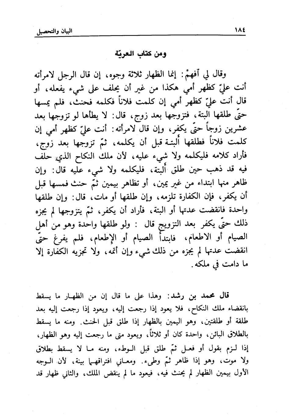 ومن كتاب العرية وقال لي: افهم، إنما الظهار ثلاثة وجوه؛ إن قال الرجل لامرأته: أنت علي كظهر أمي هكذا من غير أن يحلف على شيء يفعله، أو قال: أنت علي كظهر أمي إن كلمت فلانا، فكلمه فحنث، فلم يمسها حتى طلقها ألبتة، فتزوجها بعد زوج، قال: لا يطأها لو تزوجها بعد عشرين زوجا حتى يكفر، وإن قال لامرأته: أنت علي كظهر أمي إن كلمت فلانا فطلقها ألبتة قبل أن يكلمه، ثم تزوجها بعد زوج، فأراد كلامه، فليكلمه ولا شيء عليه؛ لأن ملك النكاح الذي حلف فيه قد ذهب حين طلق ألبتة، فليكلمه ولا شيء عليه، قال: وإن ظاهر منها ابتداء من غير يمين، أو تظاهر بيمين ثم حنث فمسها قبل أن يكفر، فإن الكفارة تلزمه، وإن طلقها أو مات قال: وإن طلقها واحدة فانقضت عدتها، أو ألبتة، فأراد أن يكفر، ثم يتزوجها لم يجزه ذلك حتى يكفر بعد التزويج، قال: ولو طلقها واحدة وهو من أهل الصيام أو الإطعام، فابتدأ الصيام أو الإطعام، فلم يفرغ حتى انقضت عدتها لم يجزه من ذلك شيء وإن أتمه، ولا تجزيه الكفارة إلا ما دامت في ملكه.