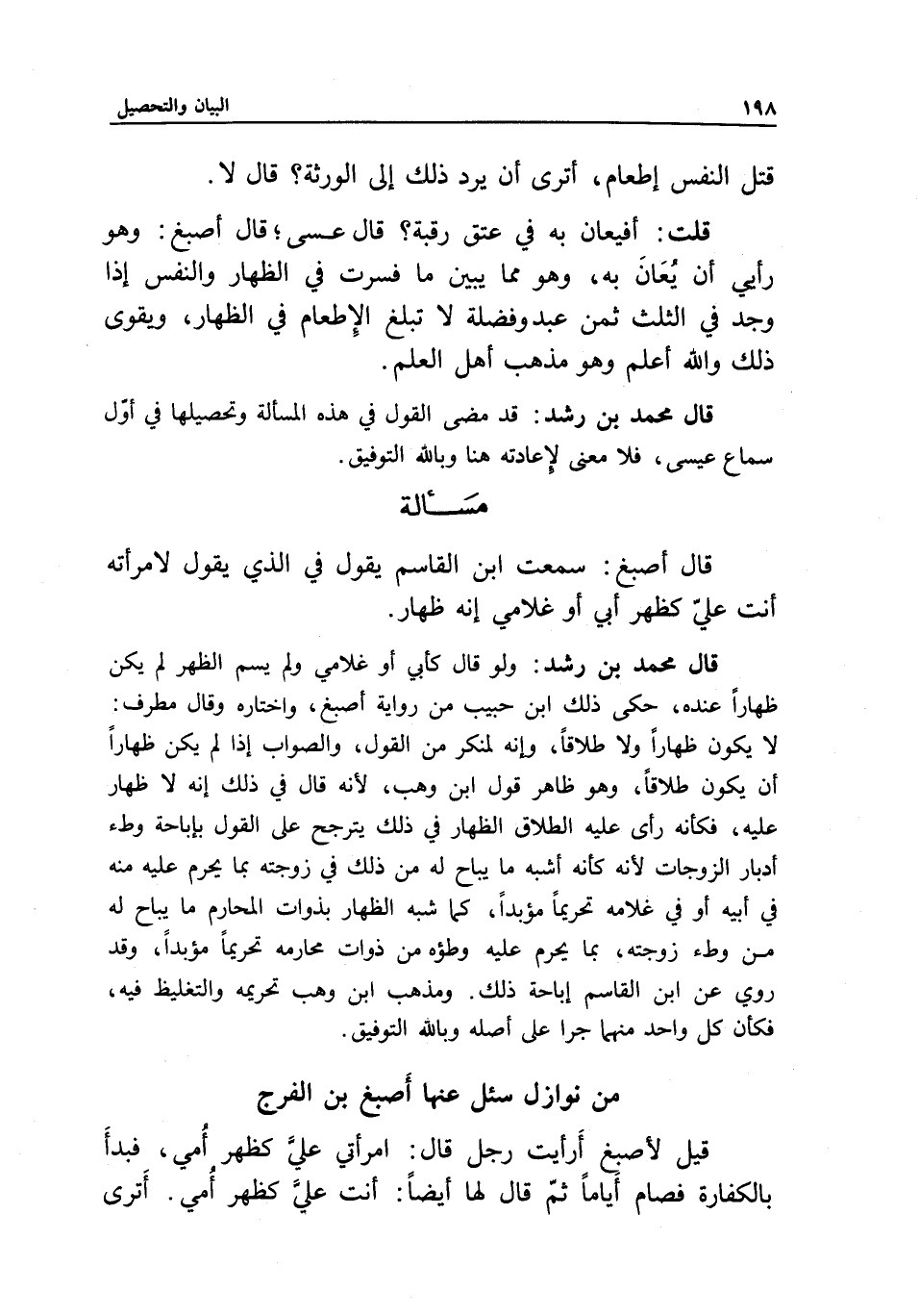 قال محمد بن رشد: ولو قال كأبي أو غلامي ولم يسم الظهر لم يكن ظهارا عنده، حكى ذلك ابن حبيب من رواية أصبغ، واختاره وقال مطرف: لا يكون ظهارا ولا طلاقا، وإنه لمنكر من القول، والصواب إذا لم يكن ظهارا أن يكون طلاقا، وهو ظاهر قول ابن وهب؛ لأنه قال في ذلك: إنه لا ظهار عليه، فكأنه رأى عليه الطلاق الظهار في ذلك يترجح على القول بإباحة وطء أدبار الزوجات؛ لأنه كأنه أشبه ما يباح له من ذلك في زوجته بما يحرم عليه منه في أبيه أو في غلامه تحريما مؤبدا، كما شبه الظهار بذوات المحارم ما يباح له من وطء زوجته، بما يحرم عليه وطؤه من ذوات محارمه تحريما مؤبدا، وقد روي عن ابن القاسم إباحة ذلك، ومذهب ابن وهب تحريمه والتغليظ فيه، فكأن كل واحد منهما جرى على أصله، وبالله التوفيق.