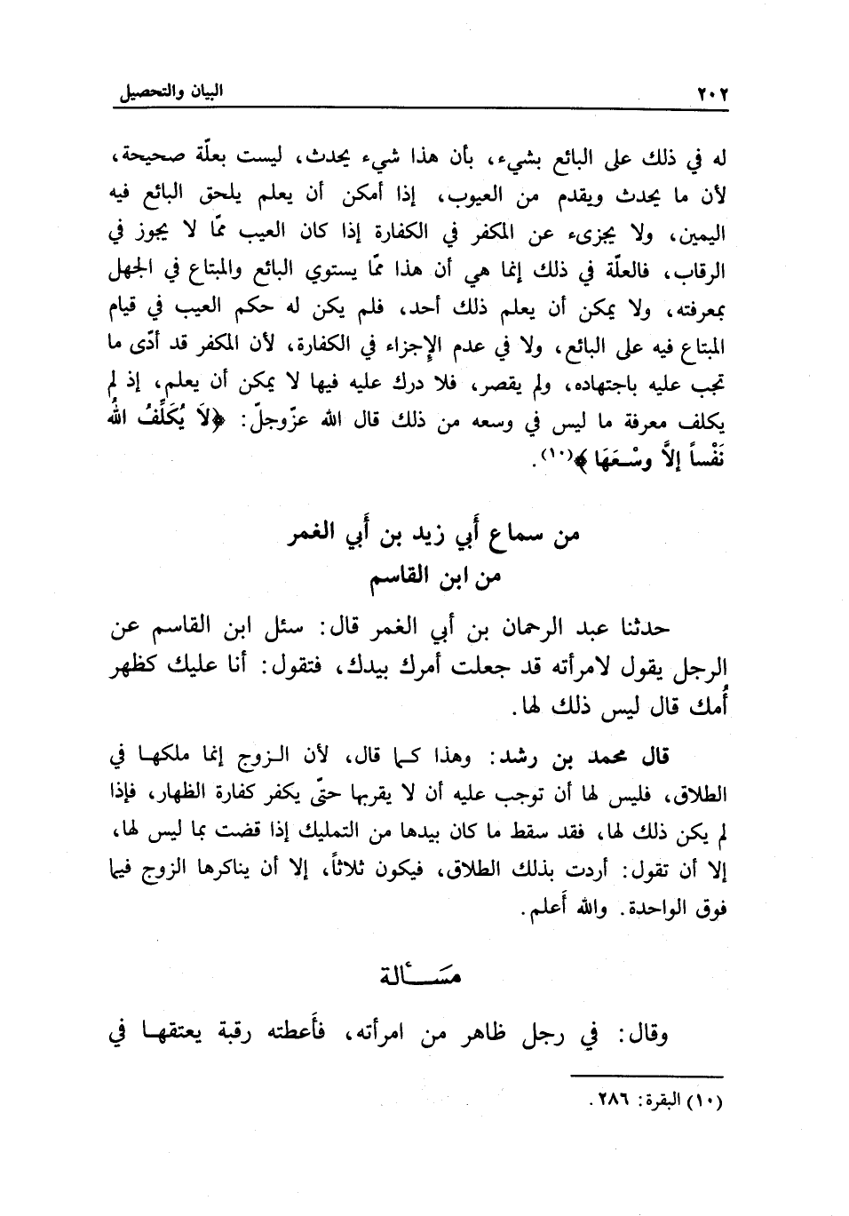له في ذلك على البائع بشيء، بأن هذا شيء يحدث، ليست بعلة صحيحة؛ لأن ما يحدث ويقدم من العيوب، إذا أمكن أن يعلم يلحق البائع فيه اليمين، ولا يجزئ عن المكفر في الكفارة إذا كان العيب مما لا يجوز في الرقاب، فالعلة في ذلك إنما هي أن هذا مما يستوي البائع والمبتاع في الجهل بمعرفته، ولا يمكن أن يعلم ذلك أحد، فلم يكن له حكم العيب في قيام المبتاع فيه على البائع، ولا في عدم الإجزاء في الكفارة؛ لأن المكفر قد أدى ما تجب عليه باجتهاده، ولم يقصر، فلا درك عليه فيها لا يمكن أن يعلم، إذ لم يكلف معرفة ما ليس في وسعه من ذلك؛ قال الله عز وجل: {لا يُكَلِّفُ اللَّهُ نَفْسًا إِلا وُسْعَهَا} [البقرة: 286] .