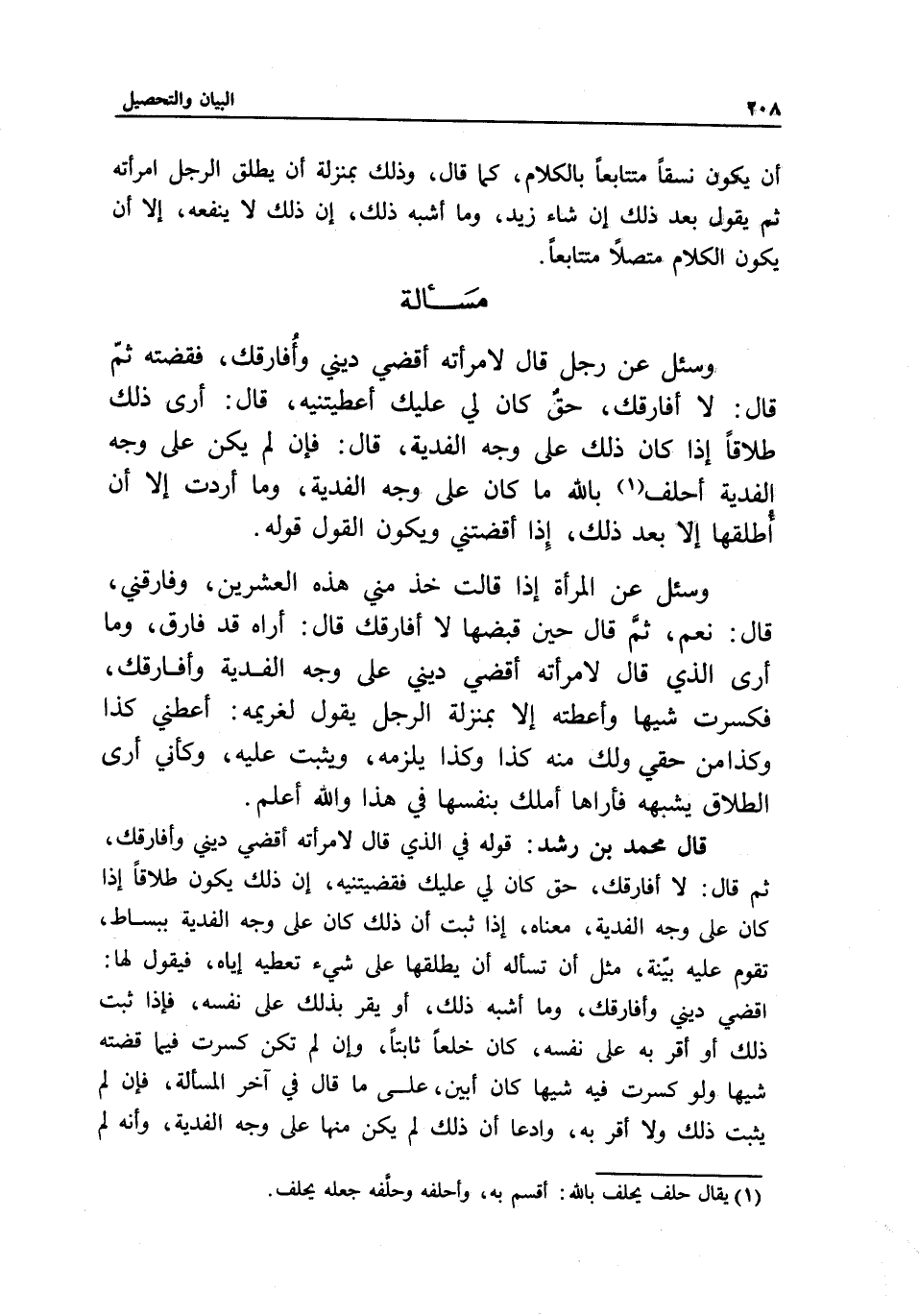 قال محمد بن رشد: قوله في الذي قال لامرأته: أقضي ديني وأفارقك، ثم قال: لا أفارقك، حق كان لي عليك فقضيتنيه، أن ذلك يكون طلاقا إذا كان على وجه الفدية، معناه: إذا ثبت أن ذلك كان على وجه الفدية ببساط، تقوم عليه بينة، مثل أن تسأله أن يطلقها على شيء تعطيه إياه، فيقول لها: اقضي ديني وأفارقك، وما أشبه ذلك، أو يقر بذلك على نفسه، فإذا ثبت ذلك أو أقر به على نفسه، كان خلعا ثابتا، وإن لم تكن كسرت فيما قضته شيها، ولو كسرت فيه شيها كان أبين، على ما قال في آخر المسألة، فإن لم يثبت ذلك ولا أقر به، وادعى أن ذلك لم يكن منها على وجه الفدية، وأنه لم