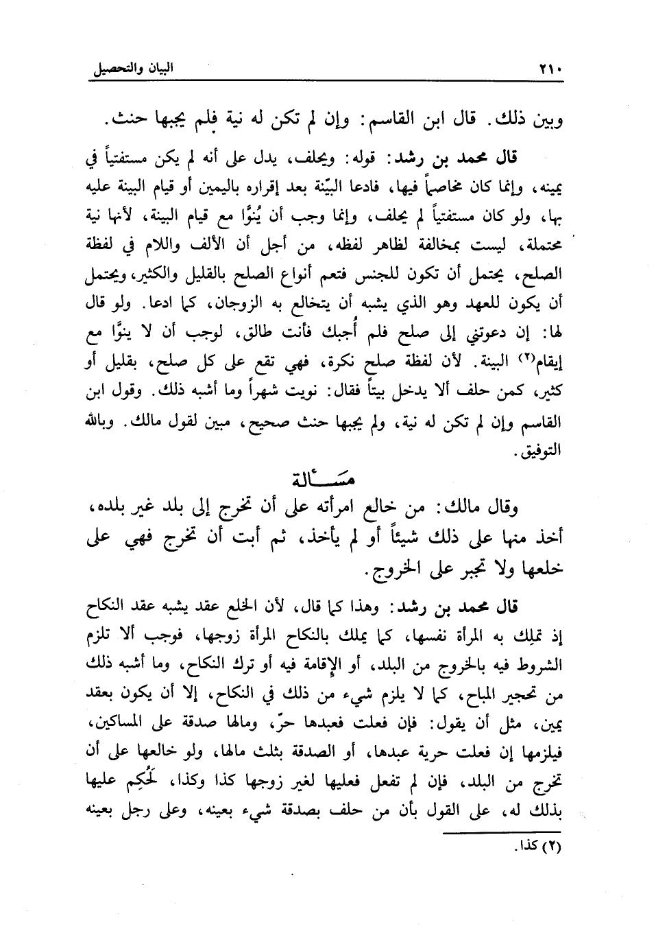 قال محمد بن رشد: وهذا كما قال؛ لأن الخلع عقد يشبه عقد النكاح إذ تملك به المرأة نفسها، كما يملك بالنكاح المرأة زوجها، فوجب ألا تلزم الشروط فيه بالخروج من البلد، أو الإقامة فيه أو ترك النكاح، وما أشبه ذلك من تحجير المباح، كما لا يلزم شيء من ذلك في النكاح، إلا أن يكون بعقد يمين، مثل أن يقول: فإن فعلت فعبدها حر، ومالها صدقة على المساكين، فيلزمها إن فعلت حرية عبدها، أو الصدقة بثلث مالها، ولو خالعها على أن تخرج من البلد، فإن لم تفعل فعليها لغير زوجها كذا وكذا، لحكم عليها بذلك له، على القول بأن من حلف بصدقة شيء بعينه، وعلى رجل بعينه