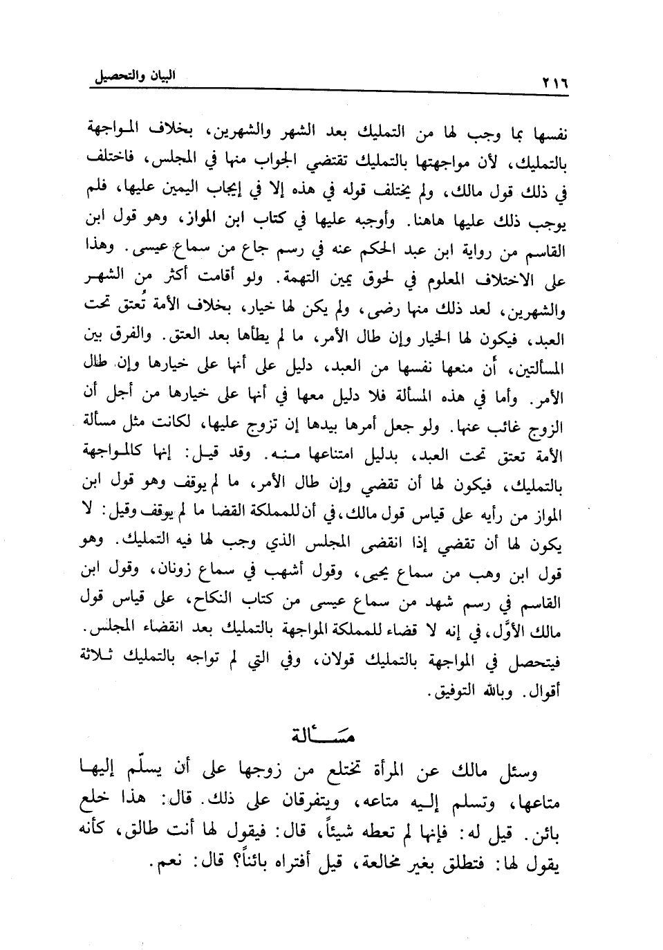 وأوجبه عليها في كتاب ابن المواز، وهو قول ابن القاسم من رواية ابن عبد الحكم عنه في رسم جاع، من سماع عيسى. وهذا على الاختلاف المعلوم في لحوق يمين التهمة، ولو أقامت أكثر من الشهر والشهرين؛ لعد ذلك منها رضا، ولم يكن لها خيار، بخلاف الأمة تعتق تحت العبد، فيكون لها الخيار وإن طال الأمر، ما لم يطأها بعد العتق، والفرق بين المسألتين، أن منعها نفسها من العبد، دليل على أنها على خيارها، وإن طال الأمر، وأما في هذه المسألة، فلا دليل معها في أنها على خيارها من أجل أن الزوج غائب عنها، ولو جعل أمرها بيدها إن تزوج عليها؛ لكانت مثل مسألة الأمة تعتق تحت العبد، بدليل امتناعها منه. وقد قيل: إنها كالمواجهة بالتمليك، فيكون لها أن تقضي وإن طال الأمر، ما لم يوقف وهو قول ابن المواز من رأيه على قياس قول مالك، في أن للمملكة القضا ما لم يوقف، وقيل: لا يكون لها أن تقضي إذا انقضى المجلس الذي وجب لها فيه التمليك، وهو قول ابن وهب من سماع يحيى، وقول أشهب في سماع زونان، وقول ابن القاسم في رسم شهد، من سماع عيسى، من كتاب النكاح، على قياس قول مالك الأول، في أنه لا قضاء للمملكة المواجهة بالتمليك بعد انقضاء المجلس، فيتحصل في المواجهة بالتمليك قولان، وفي التي لم تواجه بالتمليك ثلاثة أقوال، وبالله التوفيق.