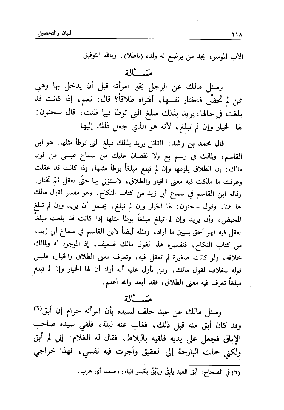 مسألة وسئل مالك عن الرجل يخير امرأته قبل أن يدخل بها، وهي ممن لم تحض فتختار نفسها، أفتراه طلاقا؟ قال: نعم، إذا كانت قد بلغت في حالها، يريد بذلك مبلغ التي توطأ فيما ظنت، قال سحنون: لها الخيار وإن لم تبلغ؛ لأنه هو الذي جعل ذلك إليها.