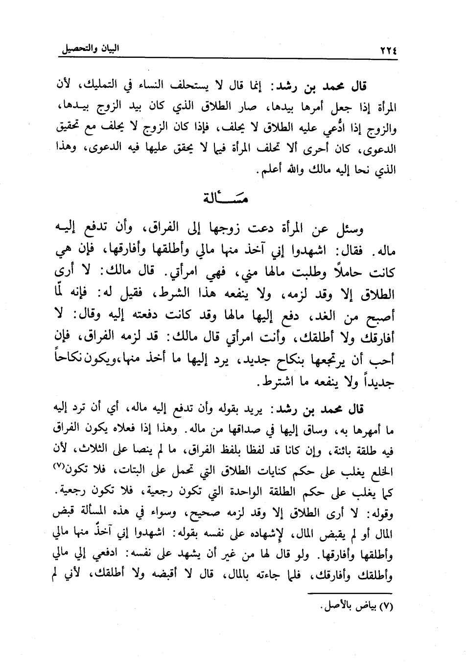 قال محمد بن رشد: يريد بقوله وأن تدفع إليه ماله، أي أن ترد إليه ما أمهرها به، وساق إليها في صداقها من ماله. وهذا إذا فعلاه يكون الفراق فيه طلقة بائنة، وإن كانا قد لفظا بلفظ الفراق، ما لم ينصا على الثلاث؛ لأن الخلع يغلب على حكم كنايات الطلاق التي تحمل على البتات، فلا تكون كما يغلب على حكم الطلقة الواحدة التي تكون رجعية، فلا تكون رجعية.