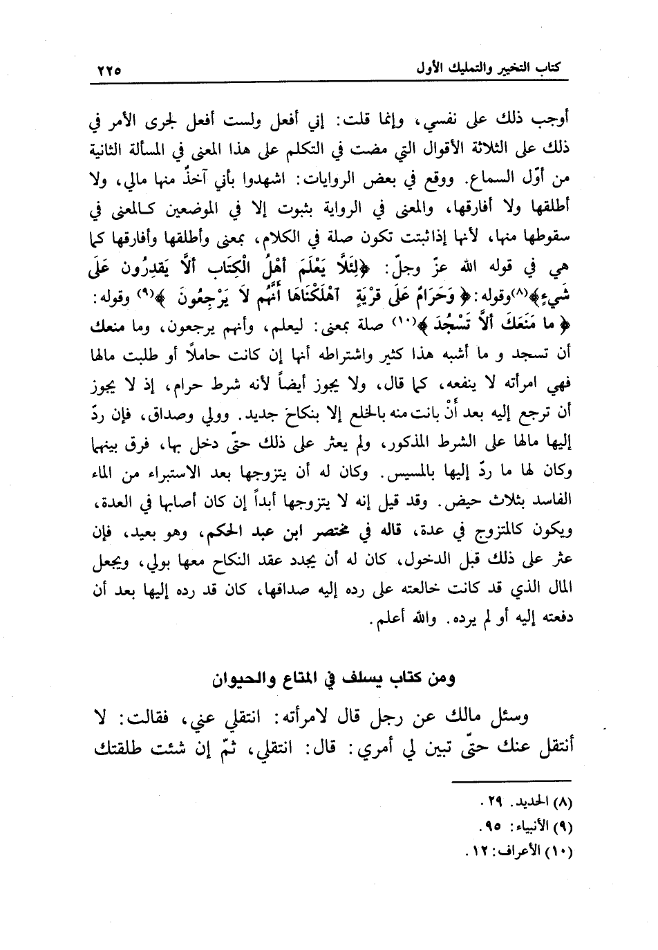 أوجب ذلك على نفسي، وإنما قلت: إني أفعل ولست أفعل لجرى الأمر في ذلك على الثلاثة الأقوال التي مضت في التكلم على هذا المعنى في المسألة الثانية من أول السماع.