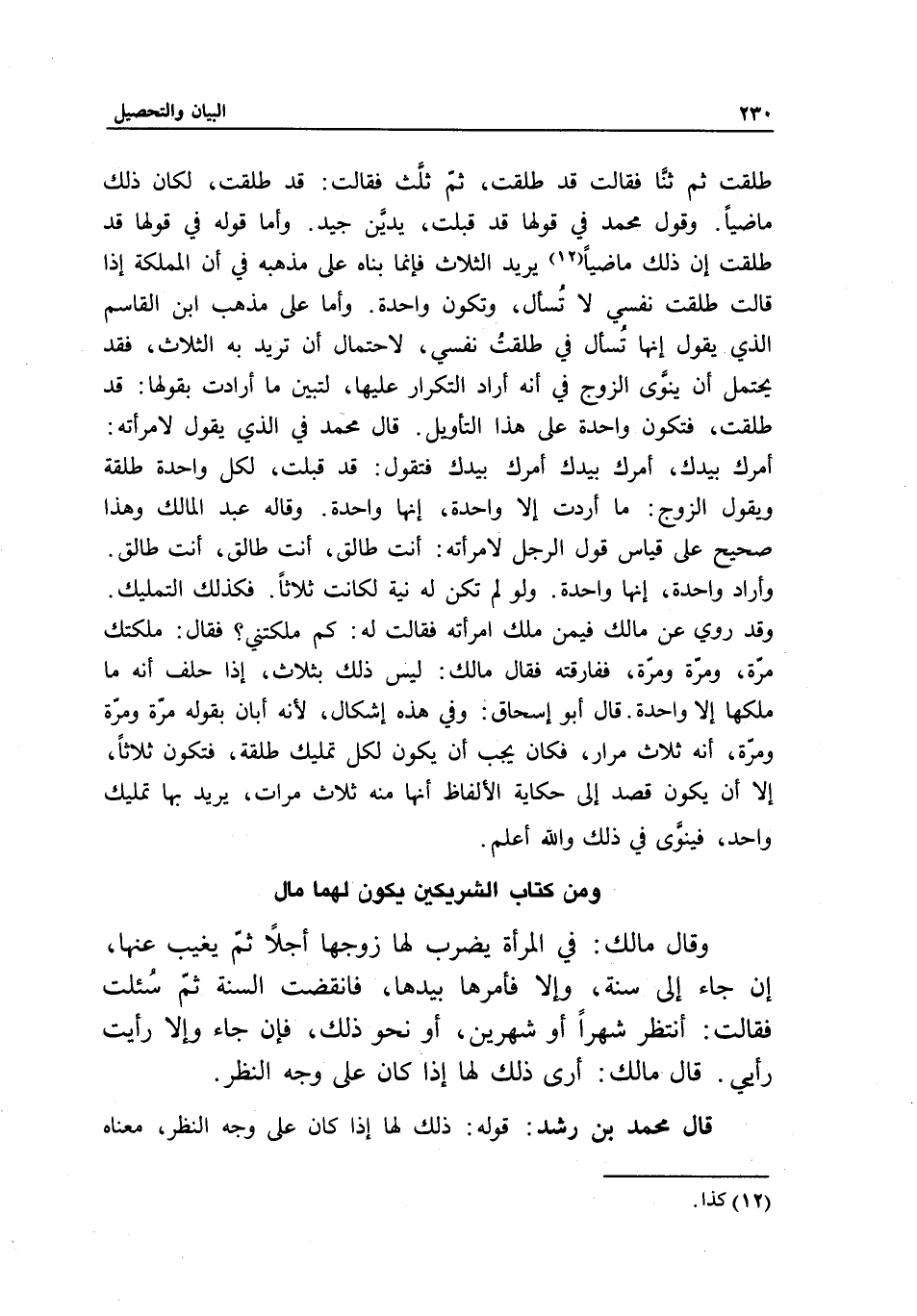 ومن كتاب الشريكين يكون لهما مال وقال مالك: في المرأة يضرب لها زوجها أجلا، ثم يغيب عنها، إن جاء إلى سنة، وإلا فأمرها بيدها، فانقضت السنة، ثم سئلت فقالت: أنتظر شهرا أو شهرين، أو نحو ذلك، فإن جاء وإلا رأيت رأيي. قال مالك: أرى ذلك لها إذا كان على وجه النظر.