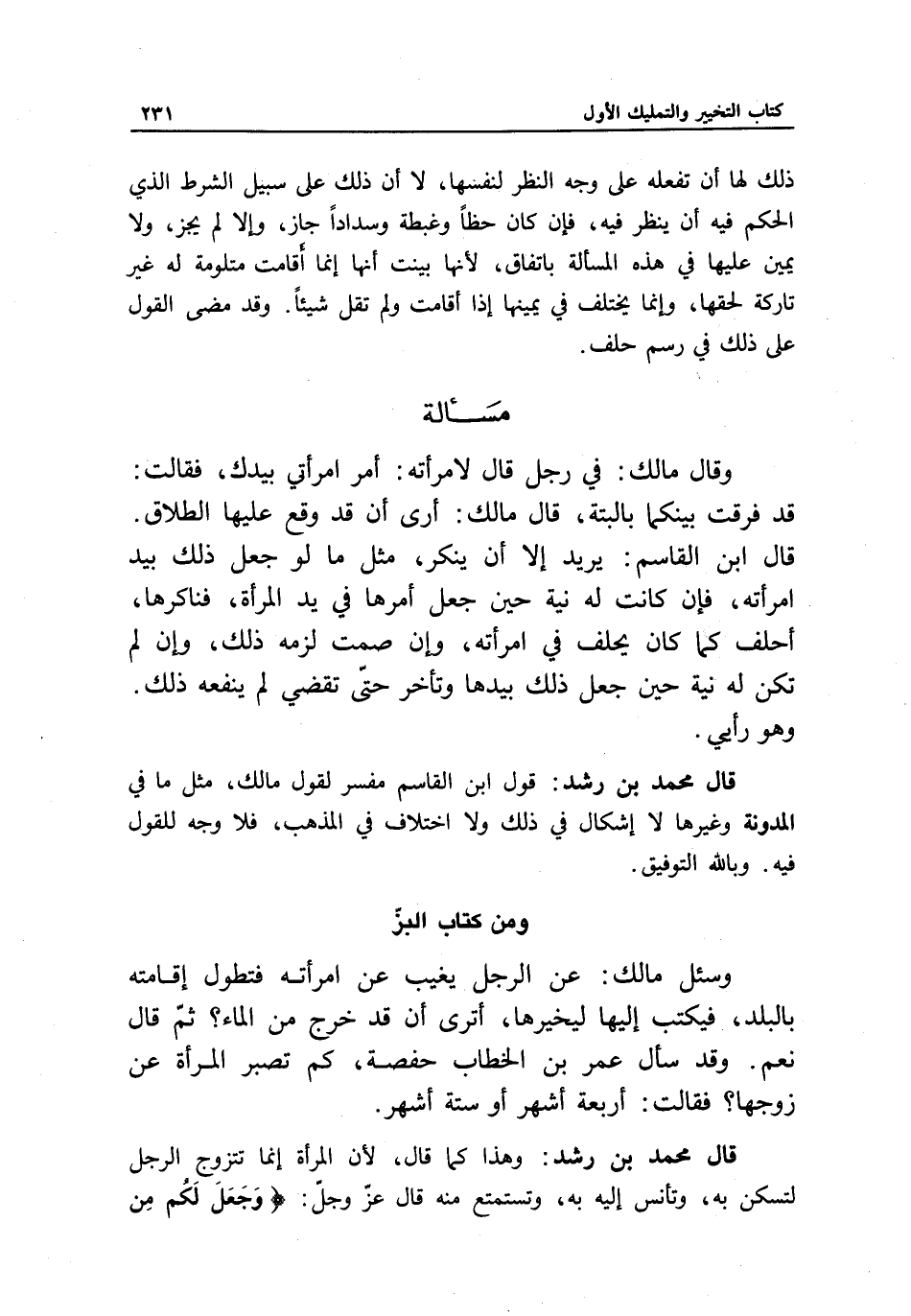قال محمد بن رشد: قول ابن القاسم مفسر لقول مالك، مثل ما في المدونة وغيرها لا إشكال في ذلك، ولا اختلاف في المذهب، فلا وجه للقول فيه، وبالله التوفيق.