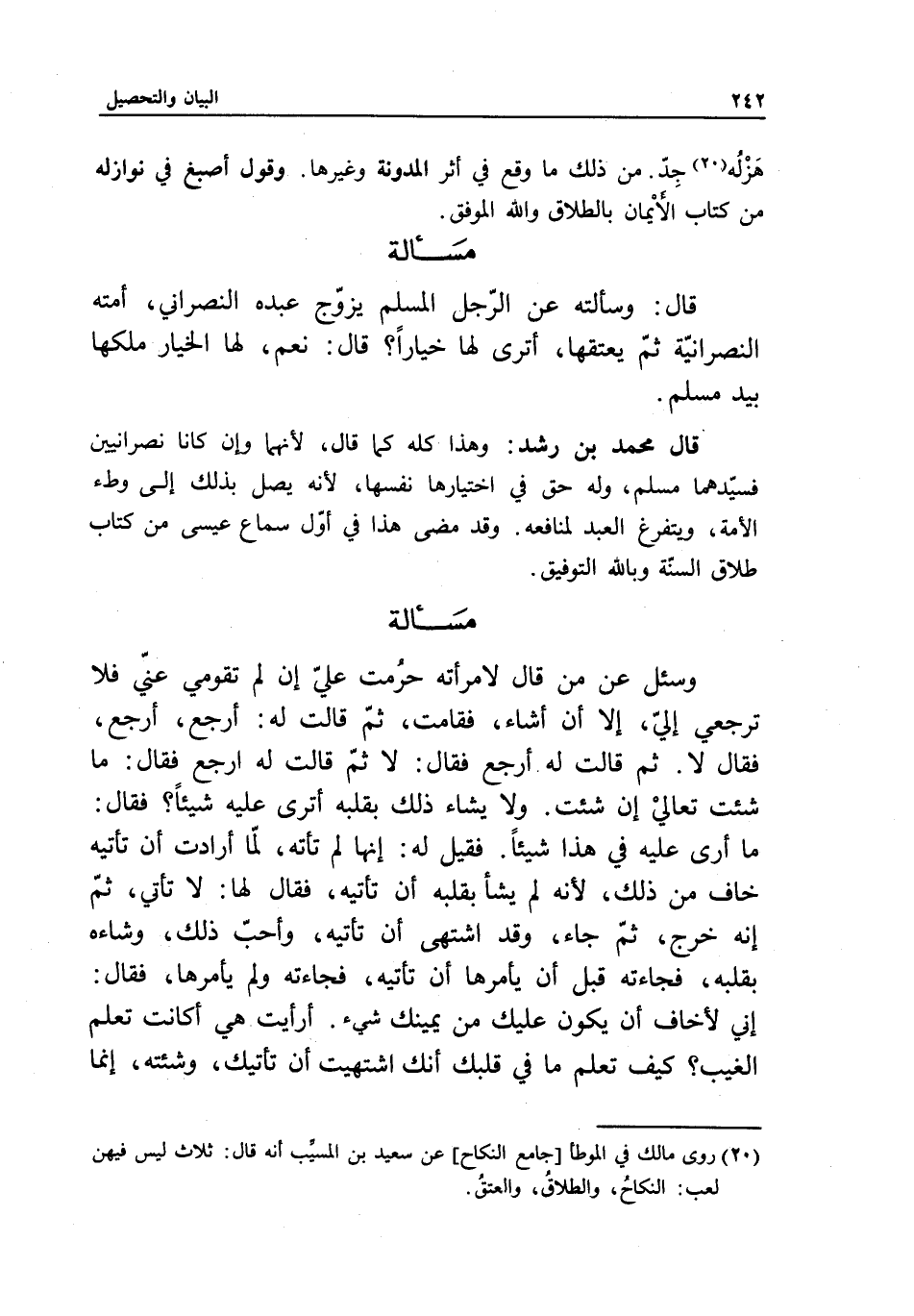 مسألة قال: وسألته عن الرجل المسلم يزوج عبده النصراني أمته النصرانية ثم يعتقها، أترى لها خيارا؟ قال: نعم، لها الخيار ملكها بيد مسلم.