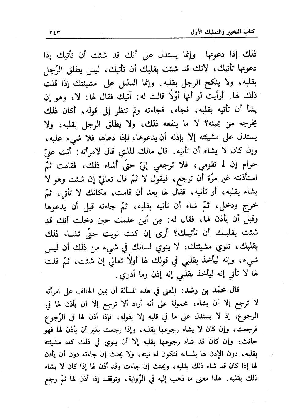 قال مالك للذي قال لامرأته: أنت علي حرام إن لم تقومي، فلا ترجعي إلي حتى أشاء ذلك، فقامت ثم استأذنته غير مرة أن ترجع، فيقول: لا، ثم قال تعالي إن شئت، وهو لا يشاء بقلبه، أو تأتيه، فقال لها بعد أن قامت، مكانك لا تأتي، ثم خرج ودخل، ثم شاء أن تأتيه بقلبه، ثم جاءته قبل أن يدعوها وقبل أن يأذن لها، فقال له: من أين علمت حين دخلت أنك قد شئت بقلبك أن تأتيك؟ أرى إن كنت نويت حتى تشاء ذلك بقلبك، تنوي مشيئتك، لا ينوي لسانك في شيء من ذلك أن ليس شيء، وأنه ليأخذ بقلبي في قولك لها أولا: تعالي إن شئت، ثم قلت لها: لا تأتي، أنه ليأخذ بقلبي أنه إذن وما أدري.