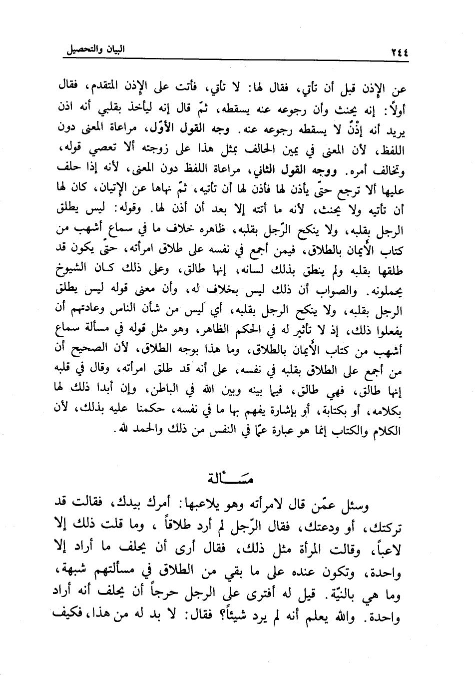 عن الإذن قبل أن تأتي، فقال لها: لا تأتي، فأتت على الإذن المتقدم، فقال أولا: إنه يحنث، وأن رجوعه عنه يسقطه، ثم قال: إنه ليأخذ بقلبي أنه إذن يريد أنه إذن لا يسقطه رجوعه عنه. وجه القول الأول مراعاة المعنى دون اللفظ؛ لأن المعنى في يمين الحالف بمثل هذا على زوجته ألا تعصي قوله، وتخالف أمره. ووجه القول الثاني مراعاة اللفظ دون المعنى؛ لأنه إذا حلف عليها ألا ترجع حتى يأذن لها، فأذن لها أن تأتيه، ثم نهاها عن الإتيان، كان لها أن تأتيه ولا يحنث؛ لأنه ما أتته إلا بعد أن أذن لها. وقوله: ليس يطلق الرجل بقلبه، ولا ينكح الرجل بقلبه، ظاهره خلاف ما في سماع أشهب من كتاب الأيمان بالطلاق، فيمن أجمع في نفسه على طلاق امرأته، حتى يكون قد طلقها بقلبه، ولم ينطق بذلك لسانه: أنها طالق، وعلى ذلك كان الشيوخ يحملونه. والصواب أن ذلك ليس بخلاف له، وأن معنى قوله ليس يطلق الرجل بقلبه، ولا ينكح الرجل بقلبه، أي ليس من شأن الناس وعادتهم أن يفعلوا ذلك، إذ لا تأثير له في الحكم الظاهر، وهو مثل قوله في مسألة سماع أشهب من كتاب الأيمان بالطلاق، وما هذا بوجه الطلاق؛ لأن الصحيح أن من أجمع على الطلاق بقلبه في نفسه، على أنه قد طلق امرأته، وقال في قلبه: إنها طالق، فهي طالق، فيما بينه وبين الله في الباطن، وإن أبدى ذلك لها بكلامه، أو بكتابة، أو بإشارة يفهم بها ما في نفسه، حكمنا عليه بذلك؛ لأن الكلام والكتاب إنما هو عبارة عما في النفس من ذلك، والحمد لله.