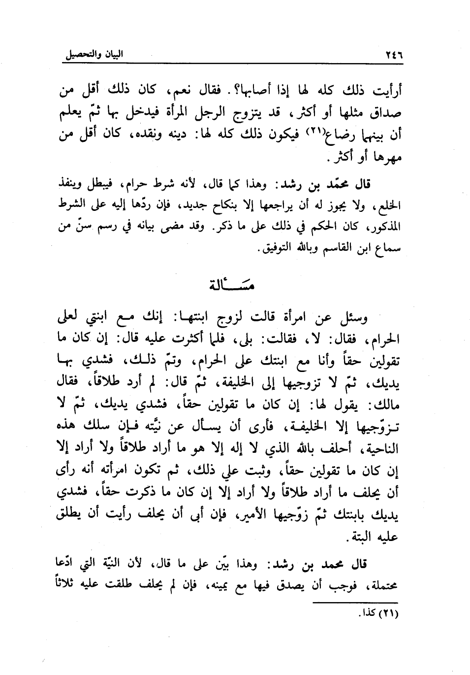 مسألة وسئل عن امرأة قالت لزوج ابنتها: إنك مع ابنتي لعلى الحرام، فقال: لا، فقالت: بلى، فلما أكثرت عليه قال: إن كان ما تقولين حقا، وأنا مع ابنتك على الحرام، وتم ذلك، فشدي بها يديك، ثم لا تزوجيها إلى الخليفة، ثم قال: لم أرد طلاقا، فقال مالك: يقول لها: إن كان ما تقولين حقا، فشدي يديك، ثم لا تزوجيها إلا الخليفة، فأرى أن يسأل عن نيته، فإن سلك هذه الناحية، أحلف بالله الذي لا إله إلا هو ما أراد طلاقا، ولا أراد إلا إن كان ما تقولين حقا، وثبت علي ذلك، ثم تكون امرأته أنه رأى أن يحلف ما أراد طلاقا، ولا أراد إلا إن كان ما ذكرت حقا، فشدي يديك بابنتك، ثم زوجيها الأمير، فإن أبى أن يحلف رأيت أن يطلق عليه البتة.