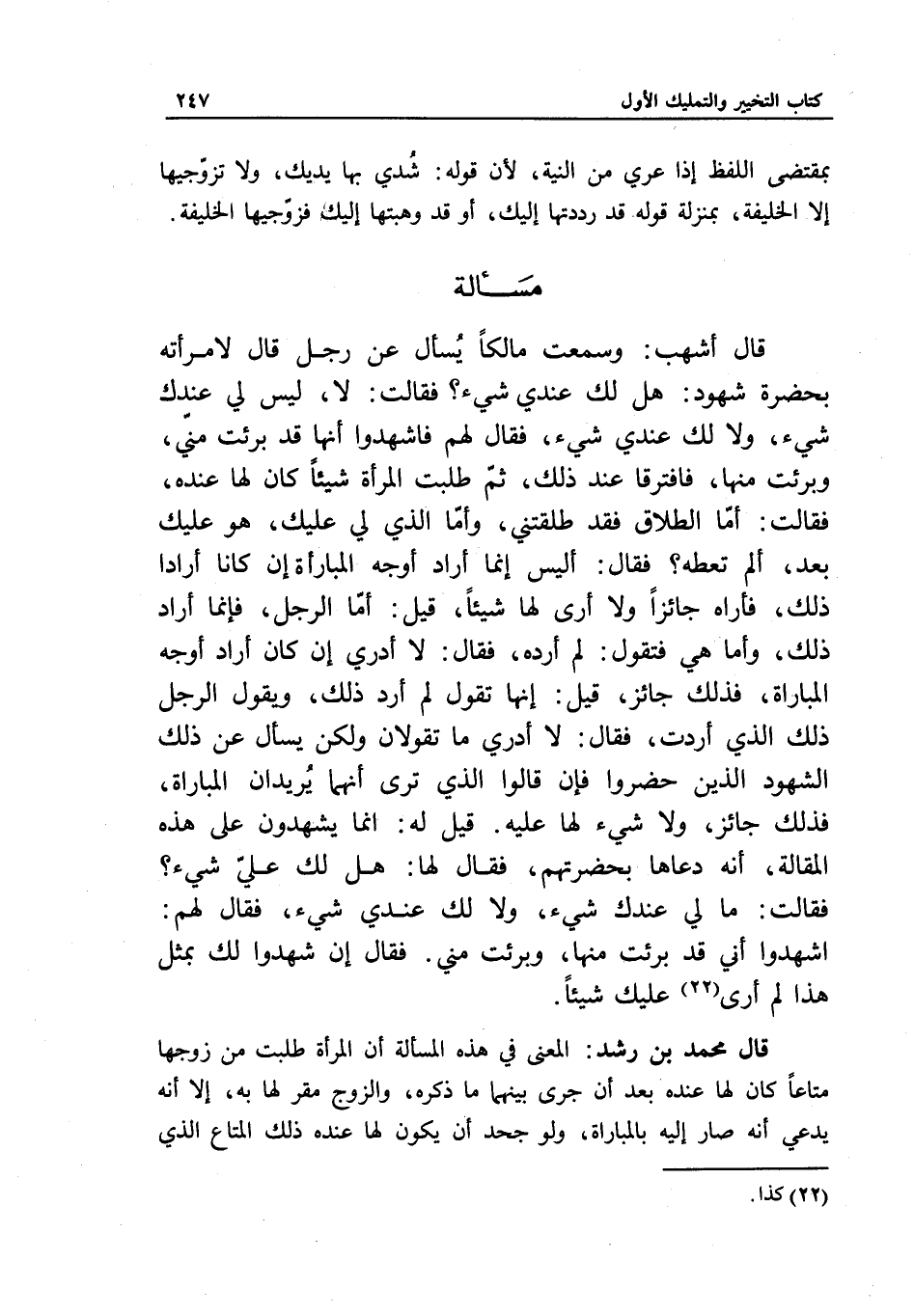 مسألة قال أشهب: وسمعت مالكا يسأل عن رجل قال لامرأته بحضرة شهود: هل لك عندي شيء؟ فقالت: لا، ليس لي عندك شيء، ولا لك عندي شيء، فقال لهم: فاشهدوا أنها قد برئت مني، وبرئت منها، فافترقا عند ذلك، ثم طلبت المرأة شيئا كان لها عنده، فقالت: أما الطلاق فقد طلقتني، وأما الذي لي عليك، هو عليك بعد، ألم تعطه؟ فقال: أليس إنما أراد أوجه المبارأة إن كانا أرادا ذلك، فأراه جائزا ولا أرى لها شيئا، قيل: أما الرجل، فإنما أراد ذلك، وأما هي فتقول: لم أرده، فقال: لا أدري إن كان أراد أوجه المباراة، فذلك جائز، قيل: إنها تقول: لم أرد ذلك، ويقول الرجل ذلك الذي أردت، فقال: لا أدري ما تقولان، ولكن يسأل عن ذلك الشهود الذين حضروا، فإن قالوا الذي ترى أنهما يريدان المباراة، فذلك جائز، ولا شيء لها عليه. قيل له: إنما يشهدون على هذه المقالة، أنه دعاها بحضرتهم، فقال لها: هل لك علي شيء؟ فقالت: ما لي عندك شيء، ولا لك عندي شيء، فقال لهم: اشهدوا أني قد برئت منها، وبرئت مني. فقال: إن شهدوا لك بمثل هذا لم أرى عليك شيئا.
